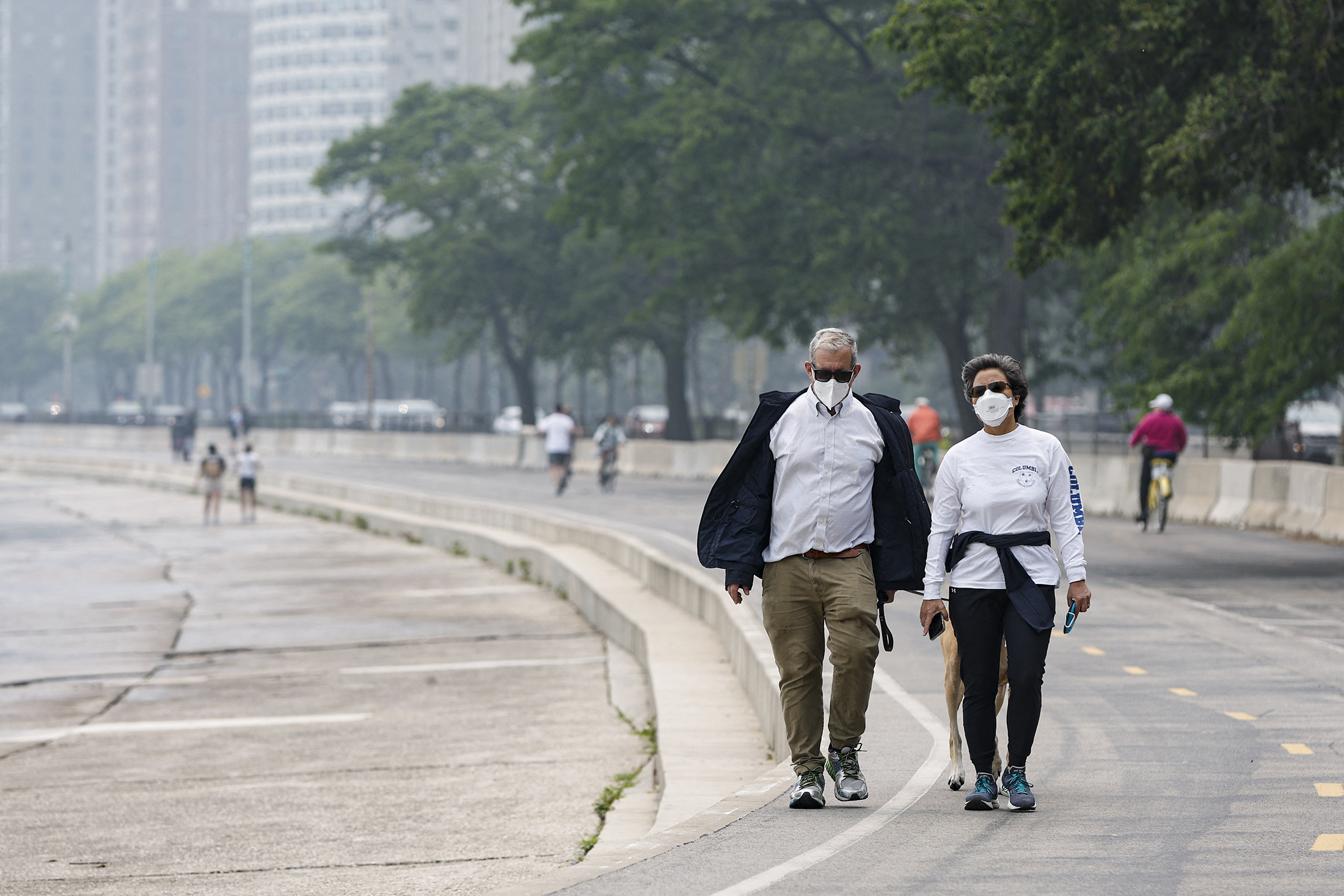 居民们在密歇根湖岸边行走,芝加哥,伊利诺伊州,6月27日,加拿大野火浓烟弥漫。