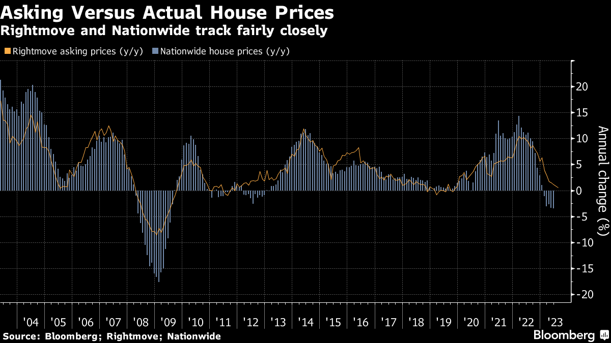 现在,对于外行来说很容易对Rightmove的数据持否定态度,我完全理解。毕竟,“要价”并不等于“成交”。但如果你看一下数据图表,要价的“幻想”趋势实际上与全国房价走势的“现实”趋势非常接近。