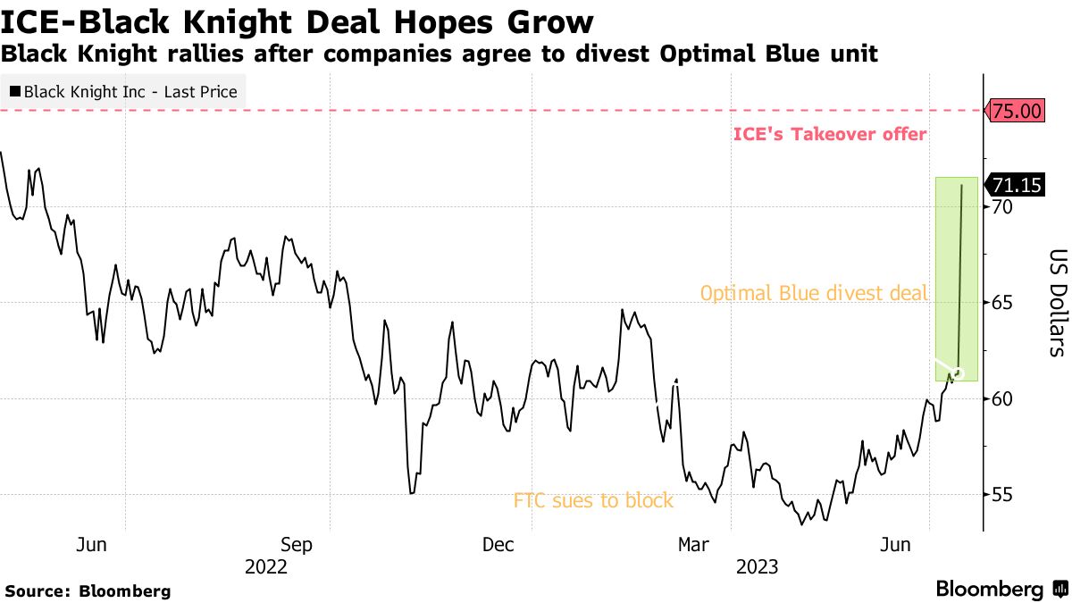 这家软件公司的股价周一上涨了16%,至71.15美元,使得与ICE的每股75美元的要约之间的差距缩小到不到4美元,而上周五收盘时的差距为13.74美元。尽管美国监管机构在三月份对这117亿美元的合并提出了质疑,但市场和华尔街分析师对这笔交易的最终结果越来越乐观,因为在一场备受关注的审判之前,黑骑士公司出售了价值7亿美元的Optimal Blue业务。