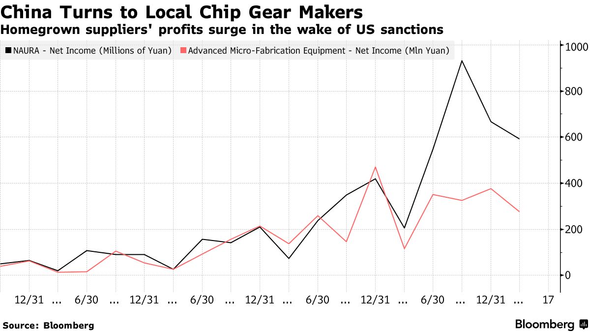 中国芯片设备利润在美国限制措施刺激本地购买后飙升 - 彭博社