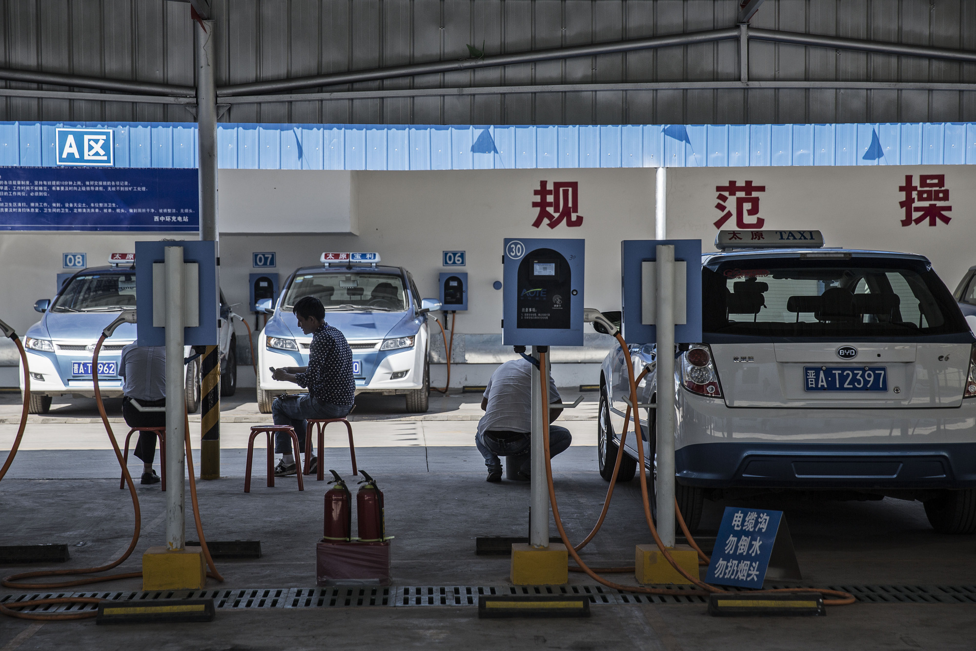 山西省太原市一个充电站的电动出租车。摄影师:Qilai Shen/Bloomberg### 销售
