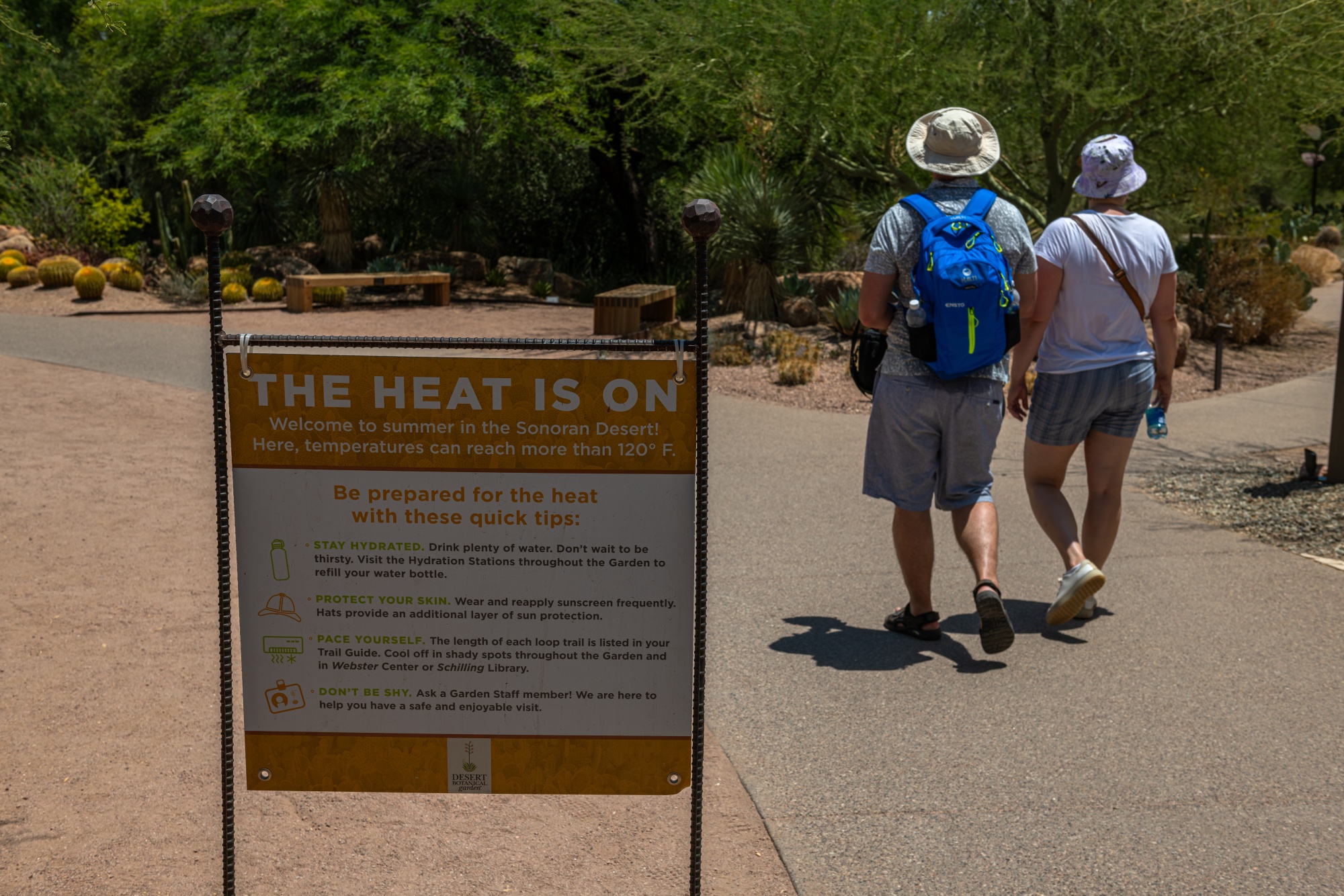 在美国亚利桑那州凤凰城,由于高温,沙漠植物园的游客提前离开,时间是2023年7月14日星期五。