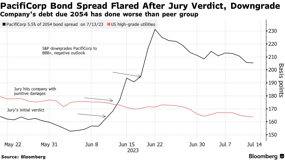 作为巴菲特的Berkshire Hathaway Energy的一部分,PacifiCorp并非公开交易,但其债券受到了裁决的打击,否则其股票可能会受到影响。标普全球将PacifiCorp的发行人信用评级下调了两个级别,并将其和其母公司的前景展望从稳定调整为负面。