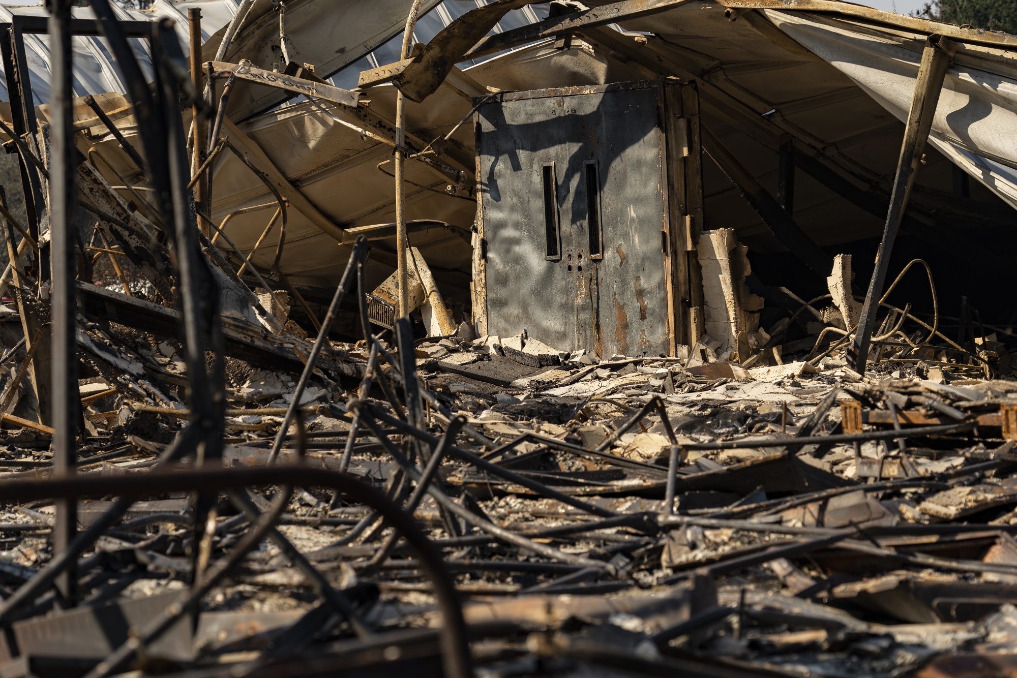 门仍然矗立在俄勒冈州盖茨市被野火摧毁的盖茨小学,时间是2020年9月。摄影师:高中村/彭博社破坏性的野火现在几乎成为美国西部夏季的例行公事,电力公用事业公司也习惯了将其电力线路和设备归咎于引发火灾。