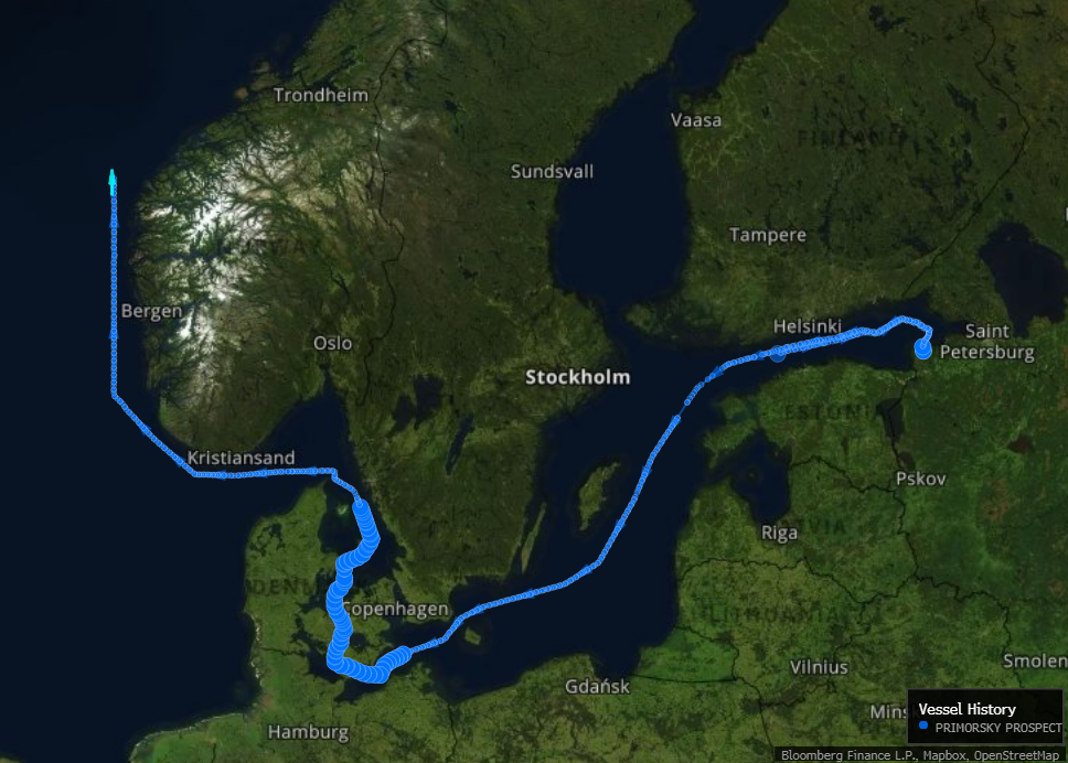 这艘Aframax级别的油轮Primorsky Prospect正沿挪威海岸向北航行,目的地显示为中国日照,预计将于8月12日抵达。这是该航线上被追踪的少数几批货物之一。