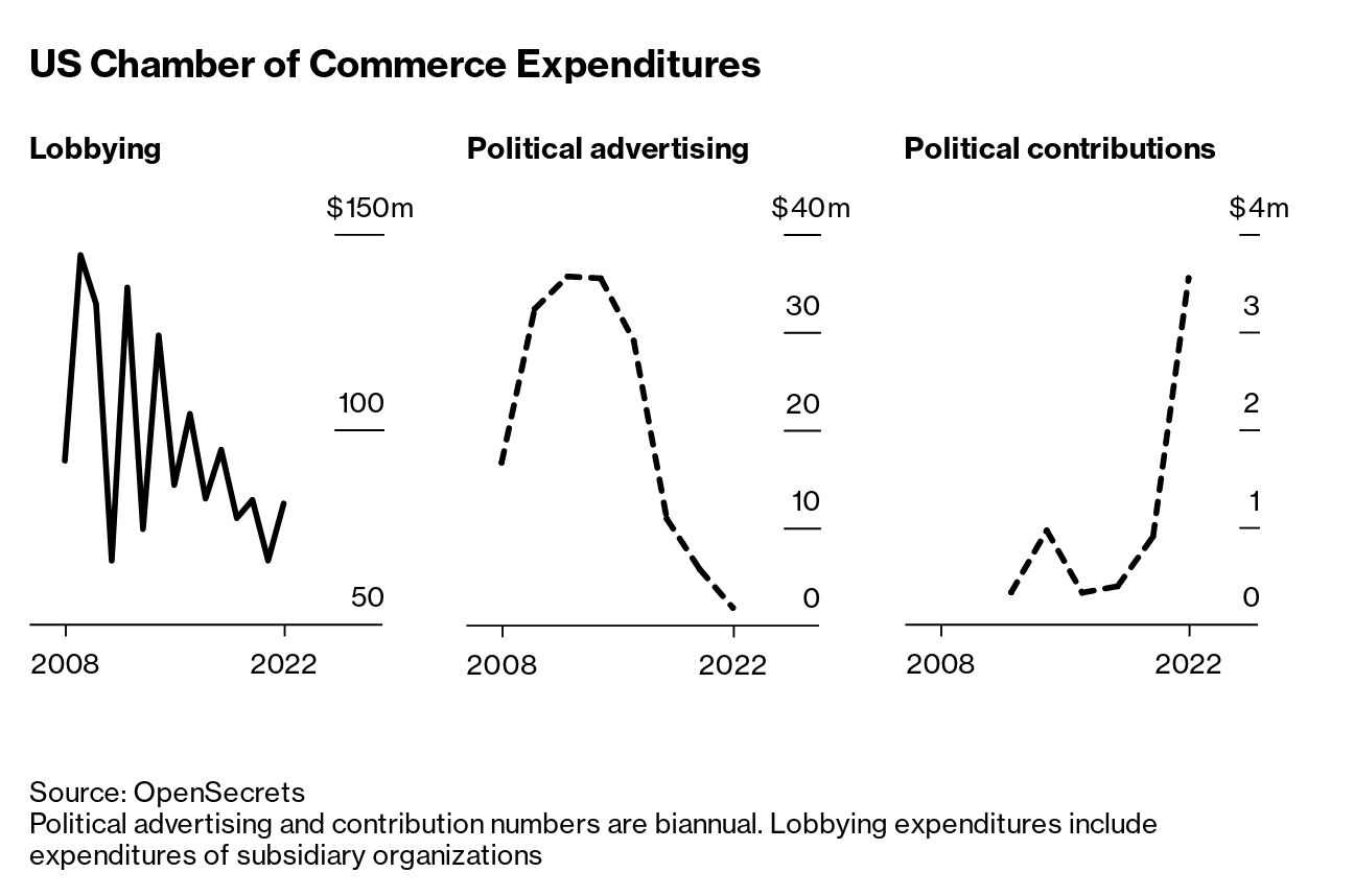 商会仍然资金充裕,这并不奇怪,考虑到其成员。资金——以及在支持和反对问题上能够大量动用资金的能力——在政治上一直给予企业优势。但商会一直在削减在长期被视为政治影响力可靠指标的领域的支出。该团体已大幅缩减了其长期以来以“议题”广告而闻名和令人畏惧的年度投资金额。根据追踪此类支出的非营利组织OpenSecrets的数据,在2022年选举周期中,商会在联邦选举中仅花费了180万美元用于此类广告,商会表示这一数字是不正确的,但不提供额外细节。