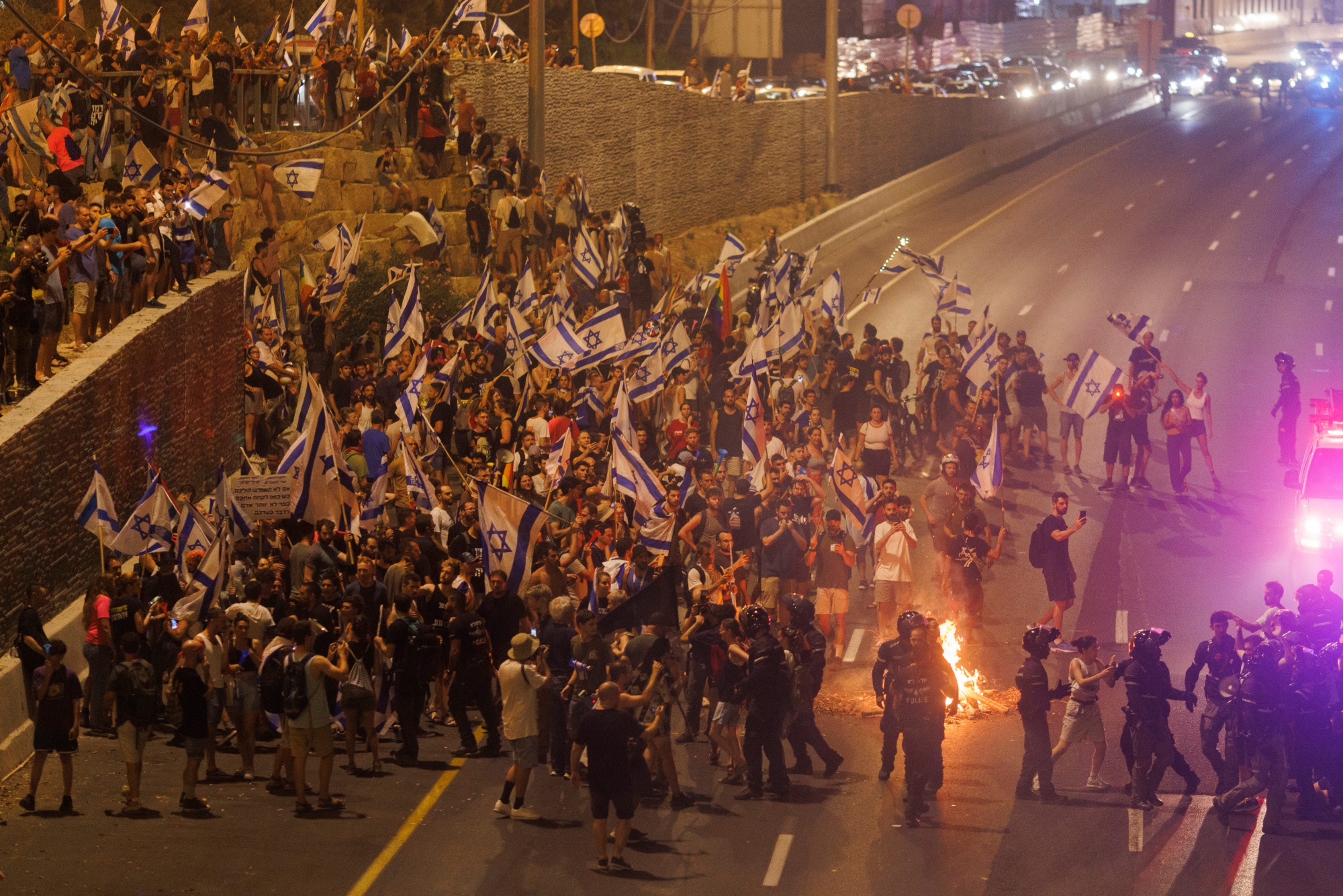 抗议者在星期二封锁了特拉维夫的一条高速公路,进行了一天的抗议活动。摄影师:科比·沃尔夫/彭博社在目前的冲突之前,巴哈拉夫-米亚拉并不是左派的宠儿。以色列质量政府运动表示内塔尼亚胡应该下台,但在几个决定上与她意见不一。