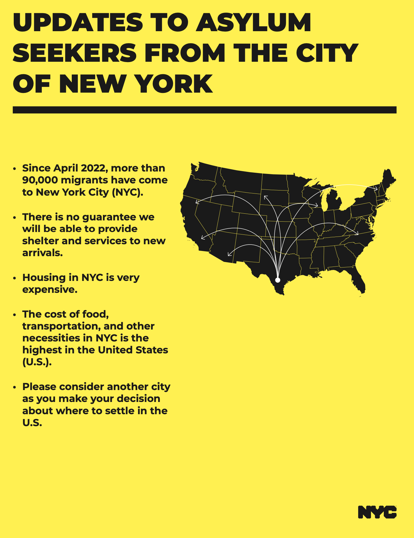 该管理部门还计划在美国南部边境分发传单,作为一项营销推动,提醒移民纽约市是一个昂贵的城市,无法保证对新到达者提供帮助。“在您决定在美国定居的地方时,请考虑其他城市,”传单上写道。