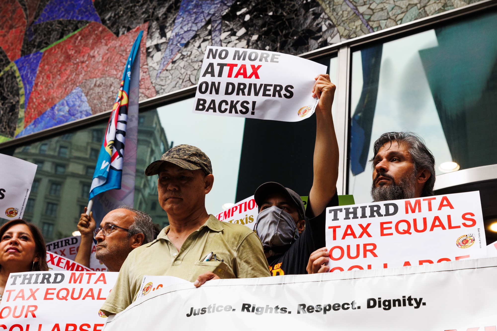 纽约出租车工人联盟成员和支持者在7月18日在纽约MTA总部外集会。摄影师:Paul Frangipane/Bloomberg纽约市计划从明年开始向驶入曼哈顿中城的司机收费,但谁应该获得新通行费的豁免尚待确定。