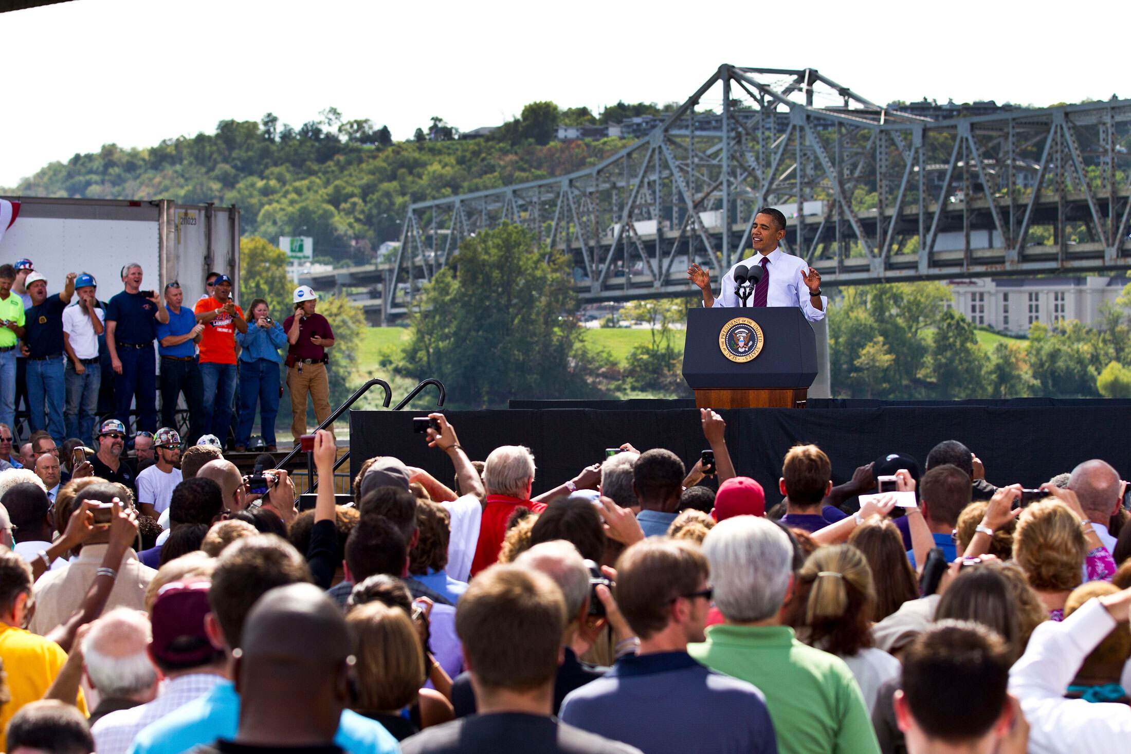 2011年奥巴马在桥附近的活动。摄影师:纽约时报/Redux的Doug Mills桥梁前进的领导人,这个组织旨在推广一种替代方案,他们表示他们并不反对重建这座桥,但俄亥俄州一侧的设计应更好地服务社区。他们的目标是解决上世纪50年代房屋、学校和企业的流失问题,当时大约有2.5万名大多数是黑人的居民不得不搬家,为I-75让路。“这是一个纠正一些错误的机会,”曾在该地区长大并支持桥梁前进的前辛辛那提市长马克·马洛里说。“我们无法拿回所有的土地,我们无法拿回建筑物,我们无法拿回文化。但我们可以开始重建那个地区的结构。”