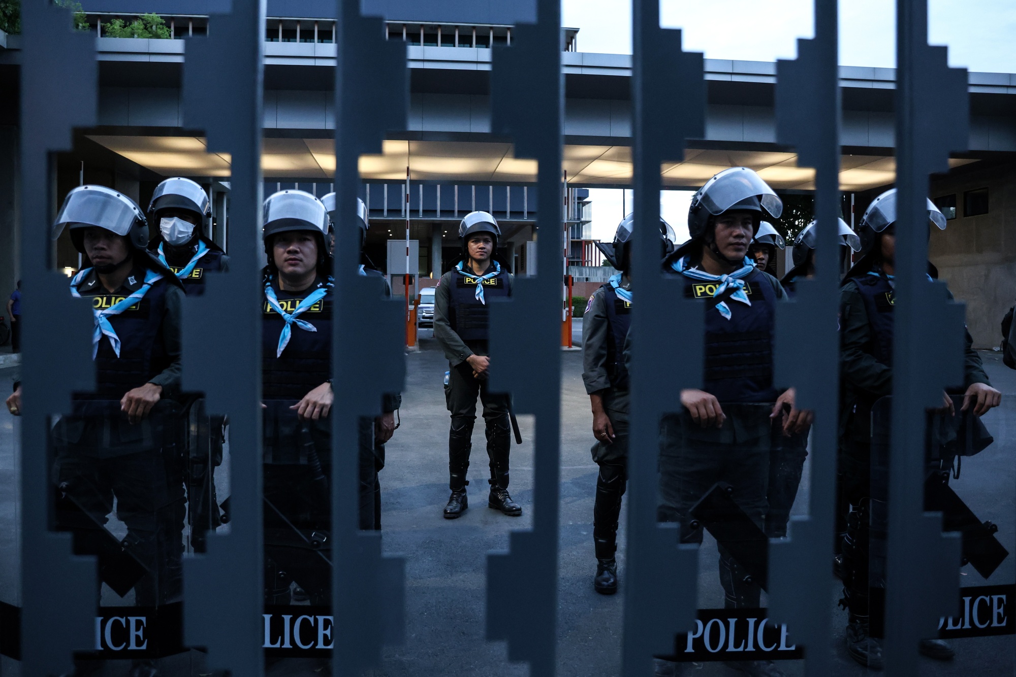 防暴警察在曼谷泰国议会大楼入口处戒备。