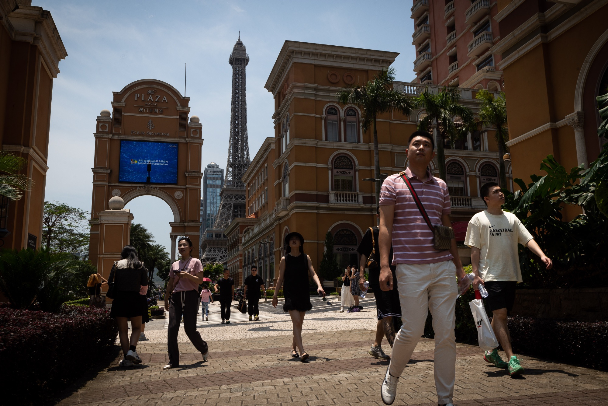 访客在中国澳门路氹金光大道上由拉斯维加斯金沙公司旗下的金沙中国有限公司经营的澳门金沙城中心,摄于四月。