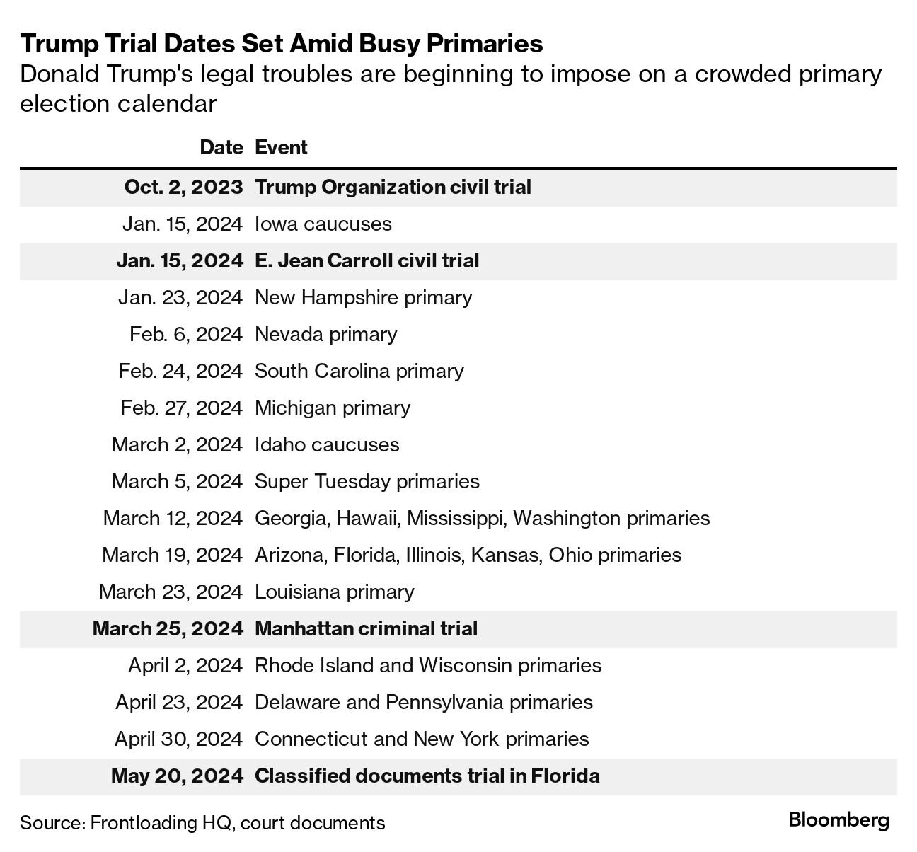审判日期在几乎所有2024年初选结束之后,但在7月的大会上正式共和党总统候选人被提名之前。如果特朗普赢得了足够多的初选,他可能在审判开始时成为共和党总统候选人。