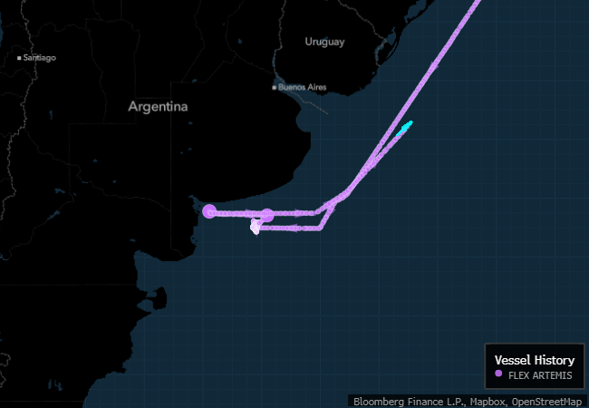 Flex Artemis在阿根廷巴伊亚布兰卡终端被政府拒绝俄罗斯货物后离开俄罗斯于2022年初入侵乌克兰,导致欧洲急需减少对俄罗斯供应的依赖,并通过液化天然气寻找替代燃气。虽然没有对俄罗斯液化天然气实施制裁,但一些欧洲国家,如英国和波罗的海国家,禁止了该国的超冷冻燃料,而其他国家则敦促不要续签供应合同。一些亚洲买家似乎也在进行多元化。