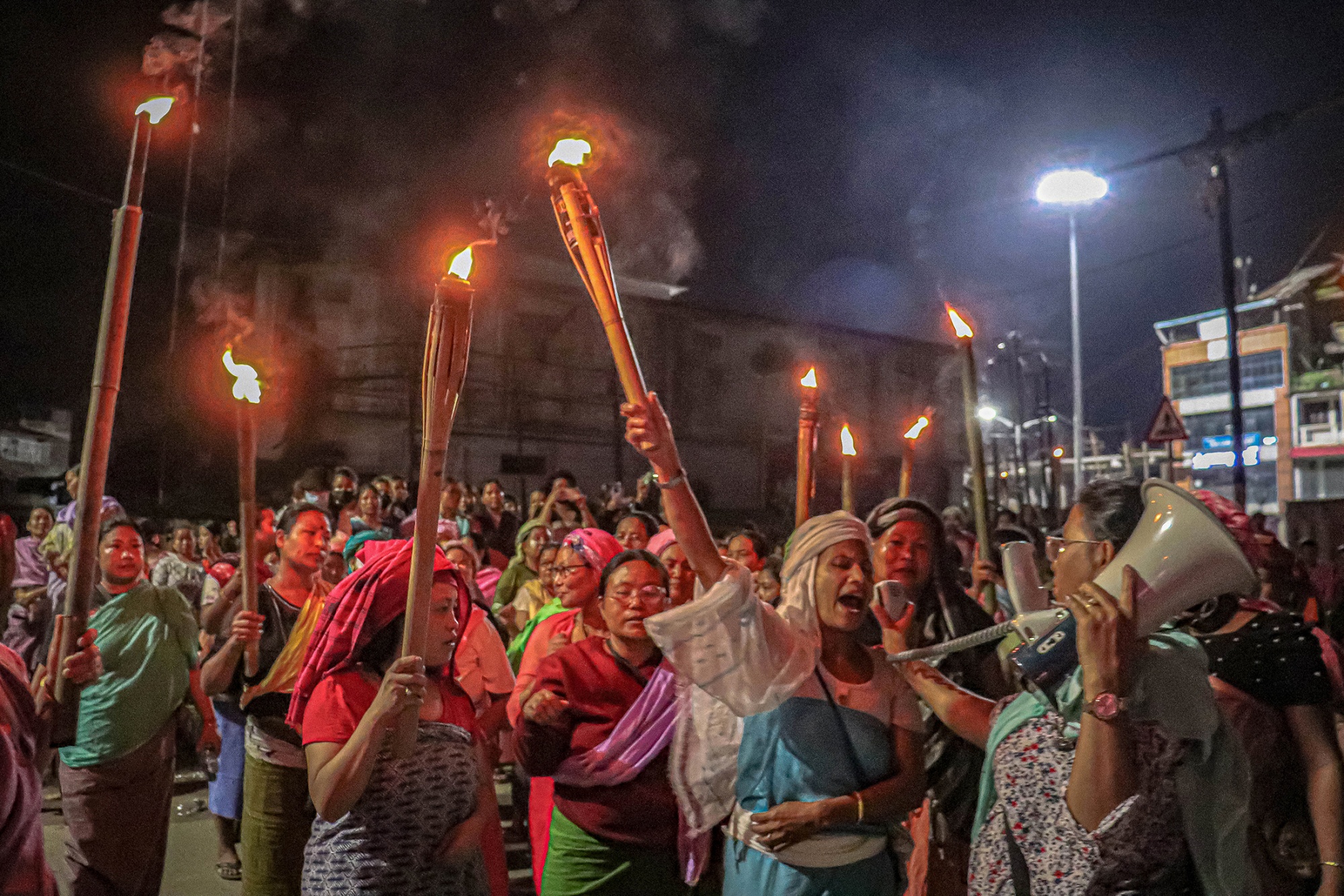 妇女手持火炬在Imphal举行示威,要求恢复和平,日期为7月18日。来源:AFP/Getty Images### 性侵案件发生了什么?