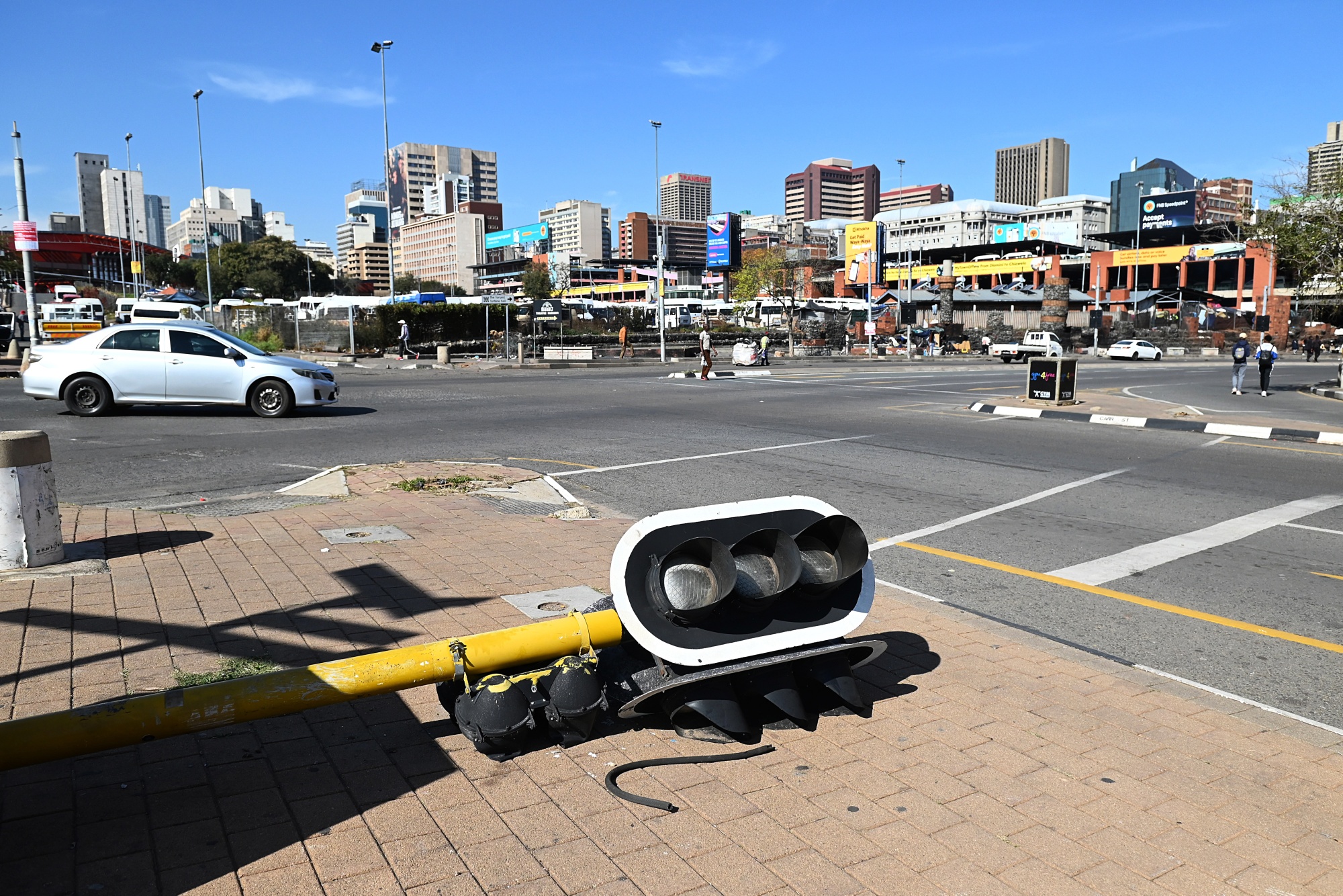 南非最大城市约翰内斯堡市中心的一盏倒下的交通灯,5月23日。