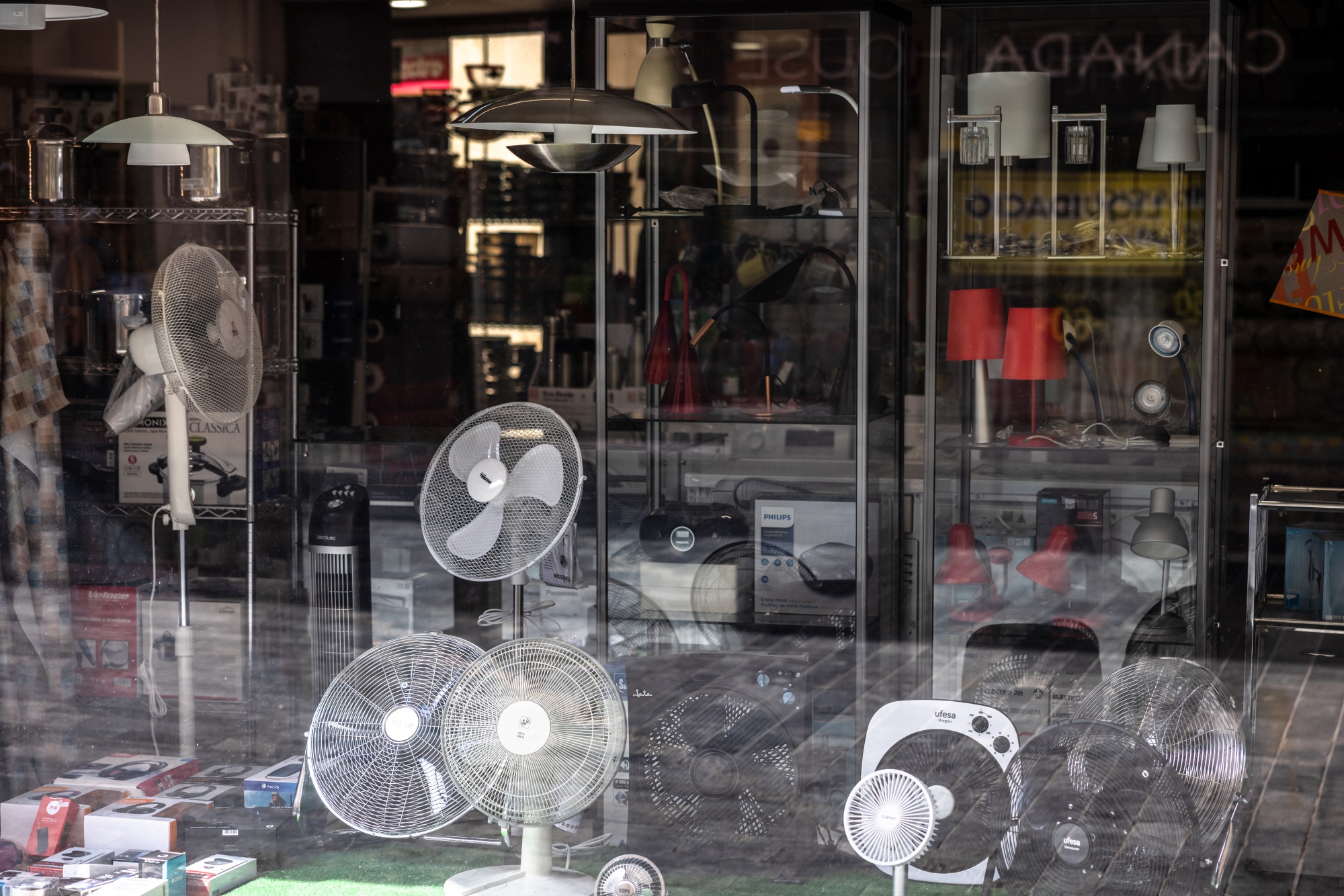 在西班牙吉罗纳的拉比斯瓦尔德埃姆普尔达,高温天气下商店橱窗里的电风扇。