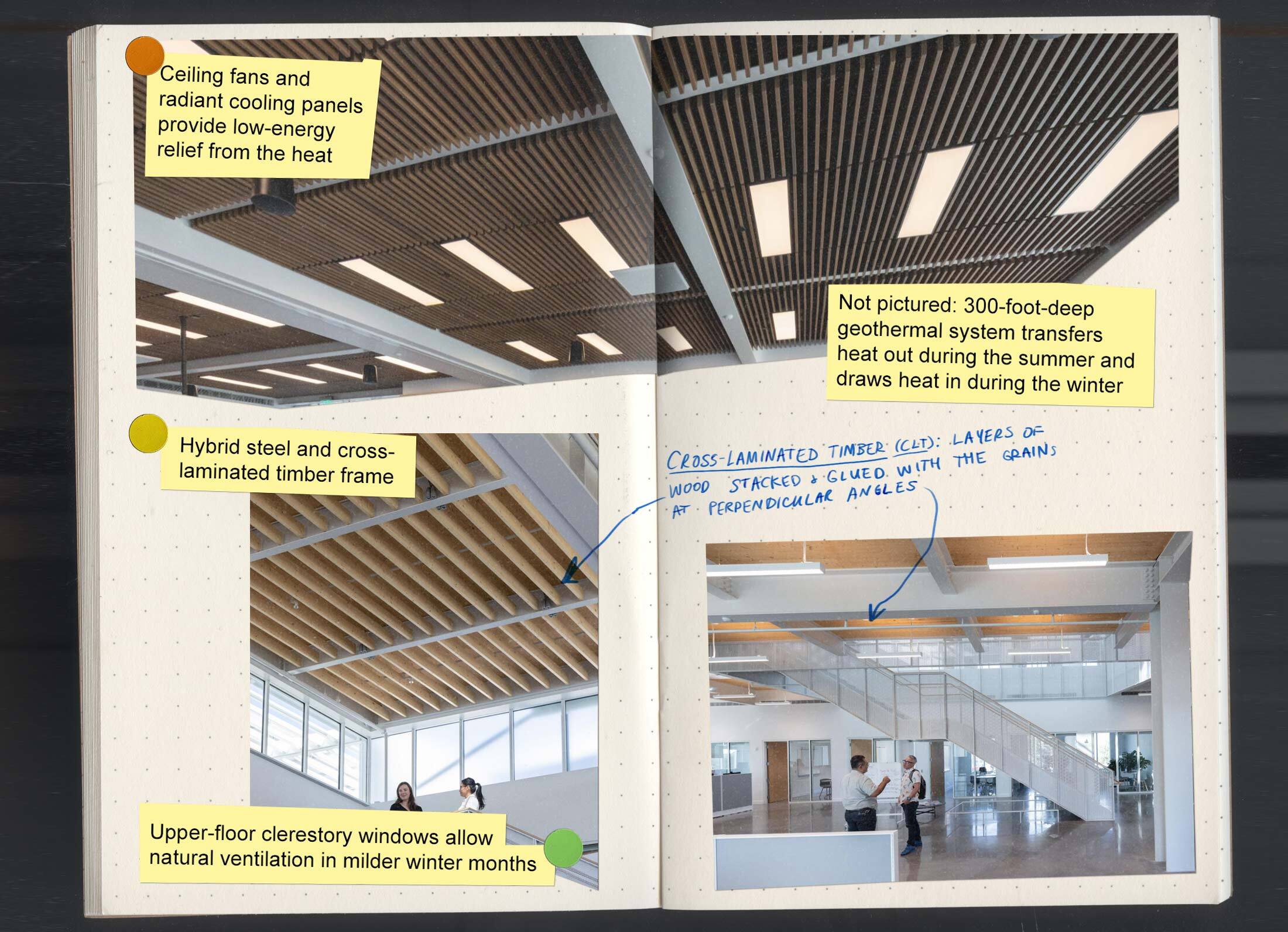 为了实现组织实现净零能源性能的目标,建筑师首先必须尽可能地缩小建筑的占地面积,然后优化其系统,最后考虑发电。循环空气的吊扇和最大化日光的天窗降低了能源消耗,而太阳能和地热系统产生能源。戴利表示,建筑师希望完全取消空调 —— 事实上,客户希望建筑能够自然通风 —— 但只有一家当地供应商竞标提供使用辐射板的系统。戴利表示,这些选择将来某一天会更便宜、更丰富,但今天德克萨斯州仍然是“上帝、枪支、橄榄球和空调”。