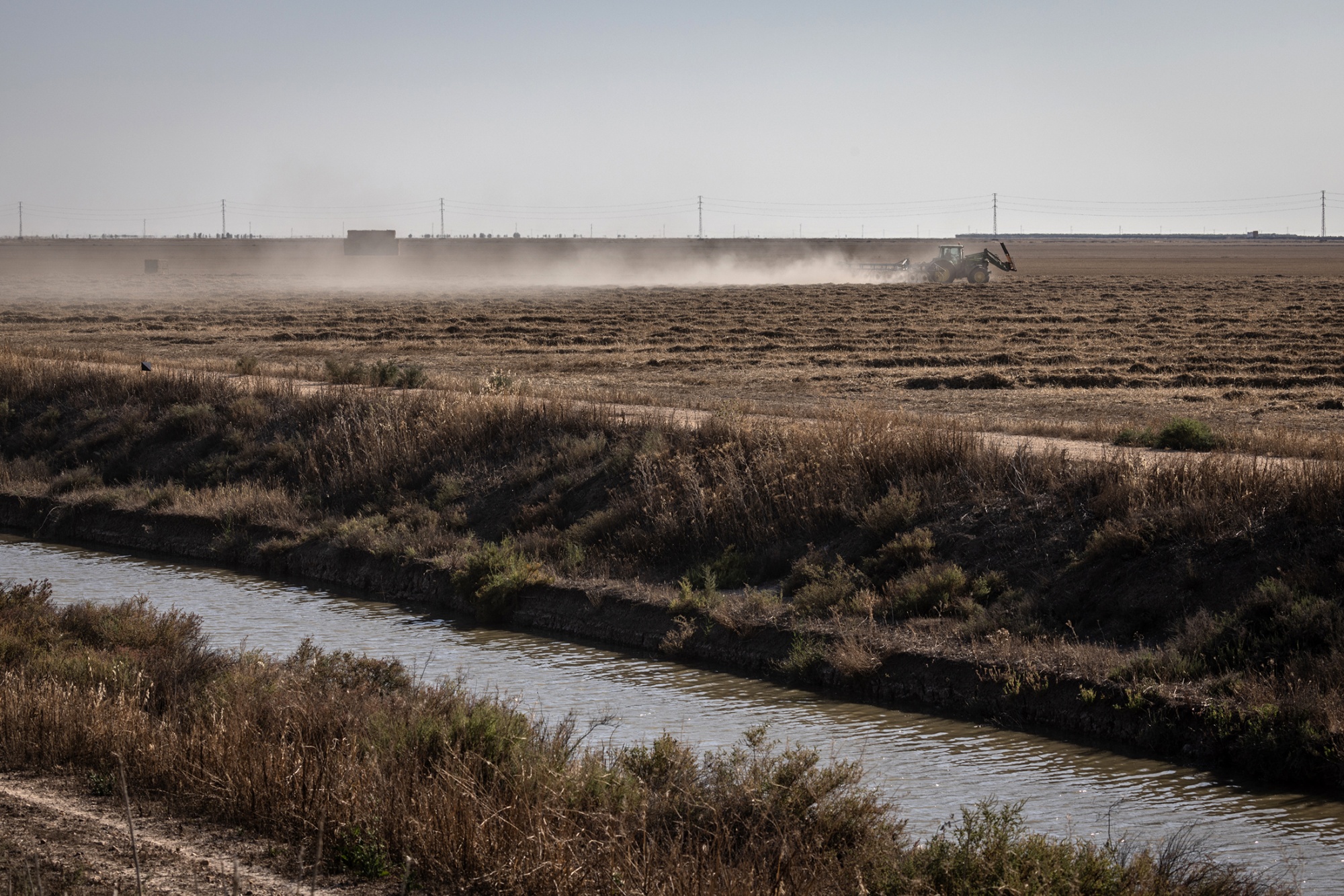 游客们看不到的是,大约25公里(15.5英里)外的一条运河将水从多纳纳引向了沿边的田地。那部分公园内干涸的草地与El Rocío的田园风光大相径庭。三只鹳鸟在一片龟裂的泥地上盘旋,那里应该有一条水流,地图显示。尽管一些湖泊在炎热的夏季经常消失,但在连续11年降雨低于平均水平后,许多湖泊现在全年都干涸。