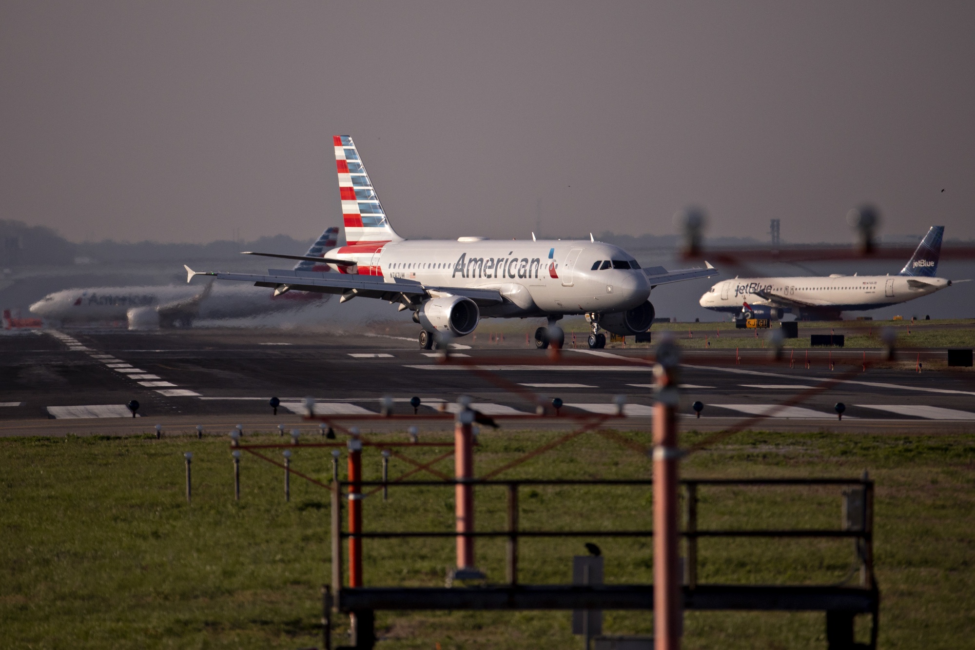 美国航空集团飞机在弗吉尼亚州阿灵顿的里根国家机场降落后滑行。
