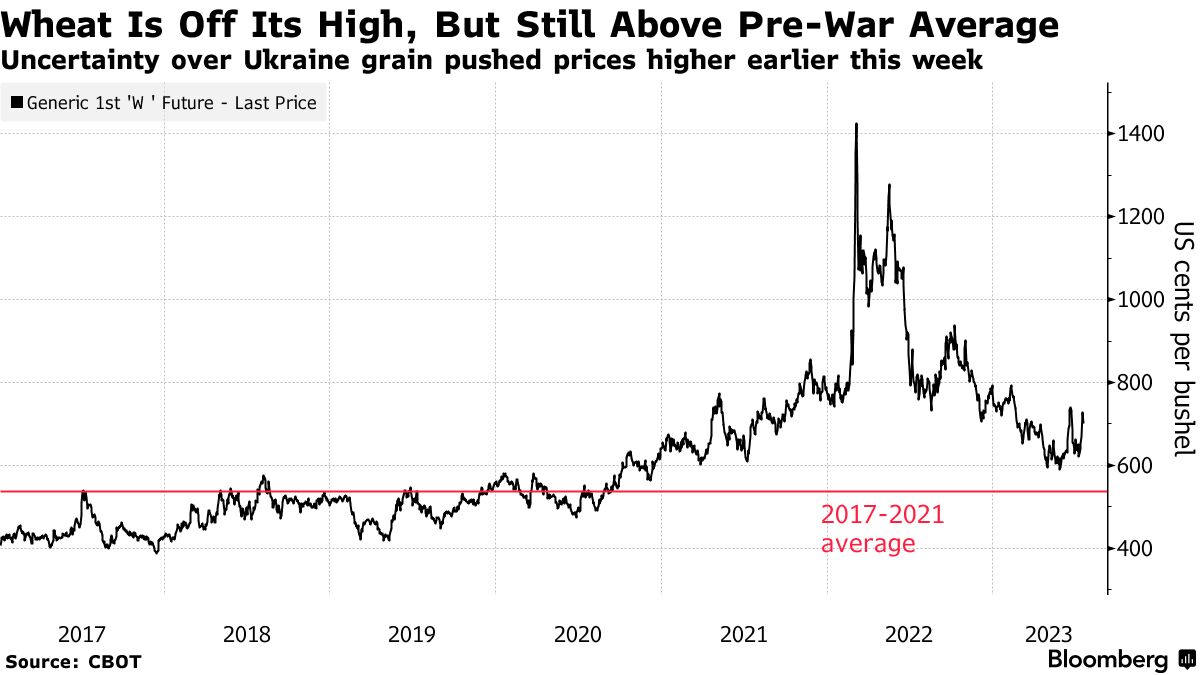 它在出口协议破裂时上涨,然后回落,随后又在俄罗斯威胁驶往乌克兰港口的船只时上涨。周五,随着乌克兰寻求恢复出口协议,价格下跌。