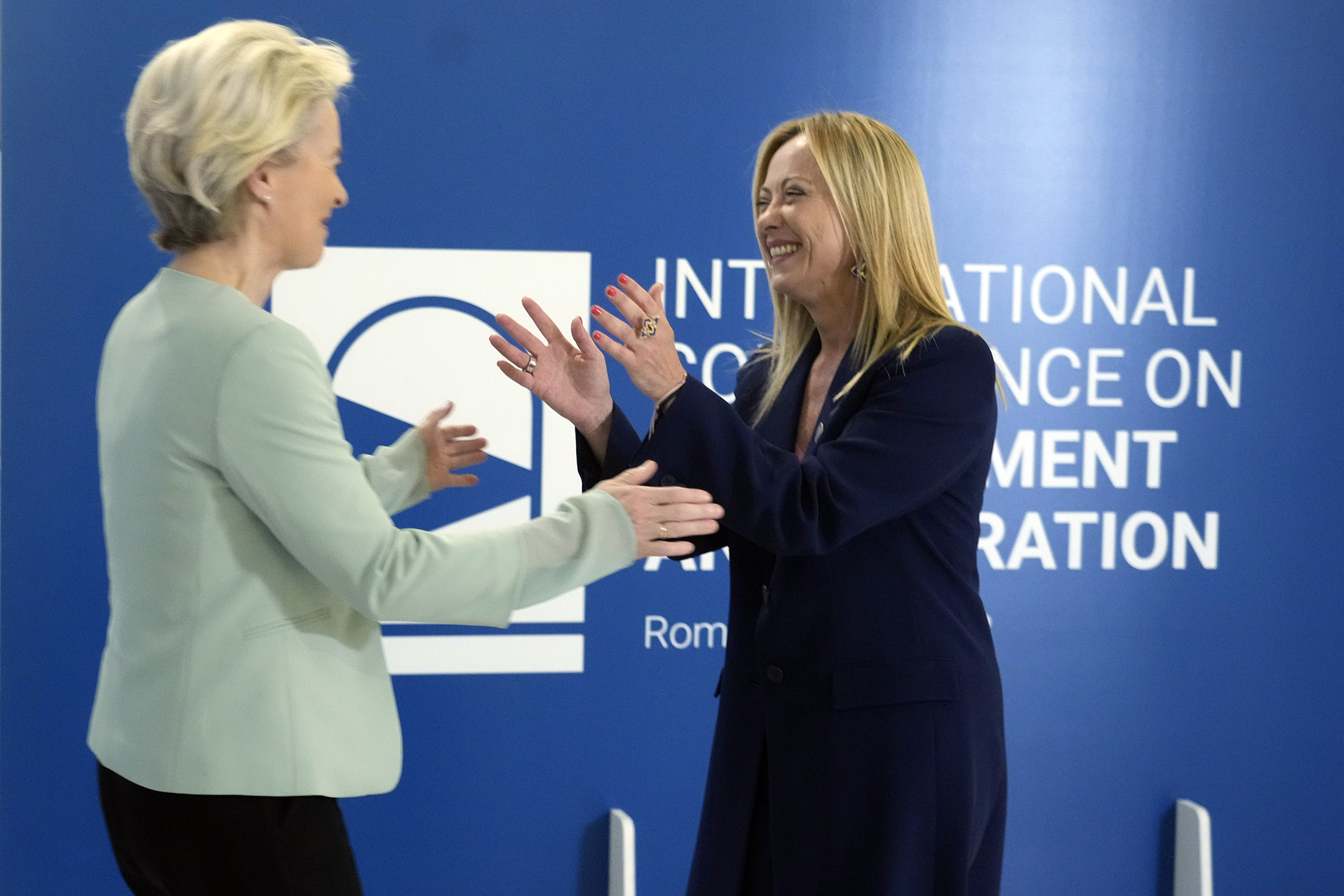 乔尔贾·梅洛尼(Giorgia Meloni)右边,7月23日在罗马欢迎乌苏拉·冯·德·莱恩(Ursula von der Leyen)。