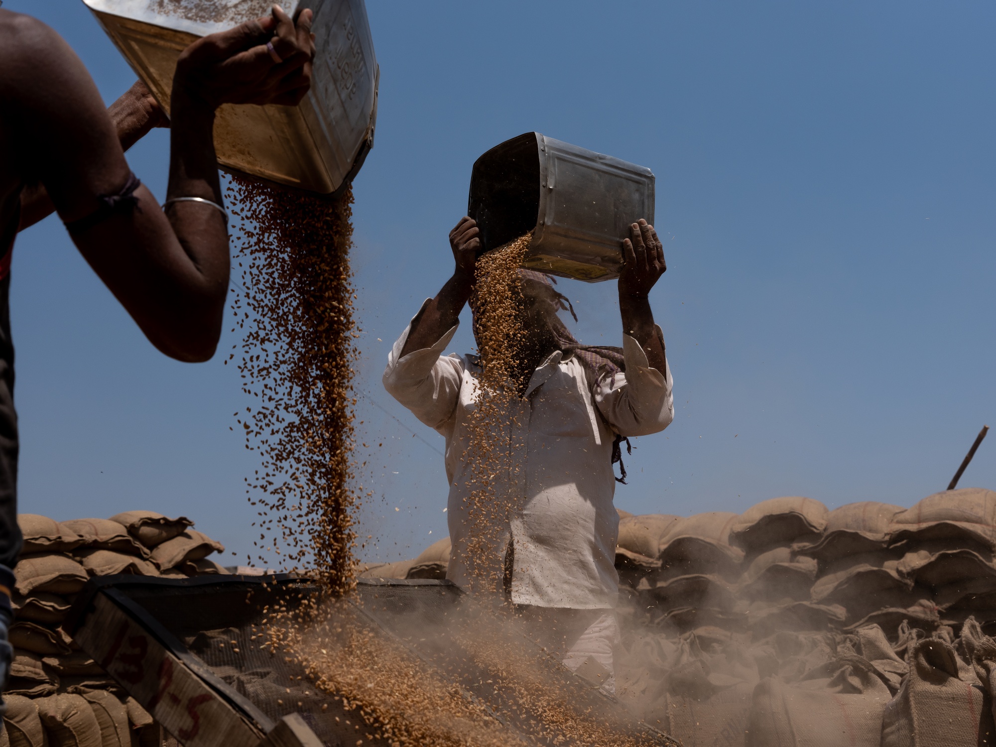 工人在印度哈里亚纳市场卸载小麦,摄于四月。摄影师:Anindito Mukherjee/Bloomberg**大饥饿。**随着灼热的温度摧毁从美国到中国的农场,收成和食品生产再次面临压力。这些是价格飙升和丰收的幸运地方。