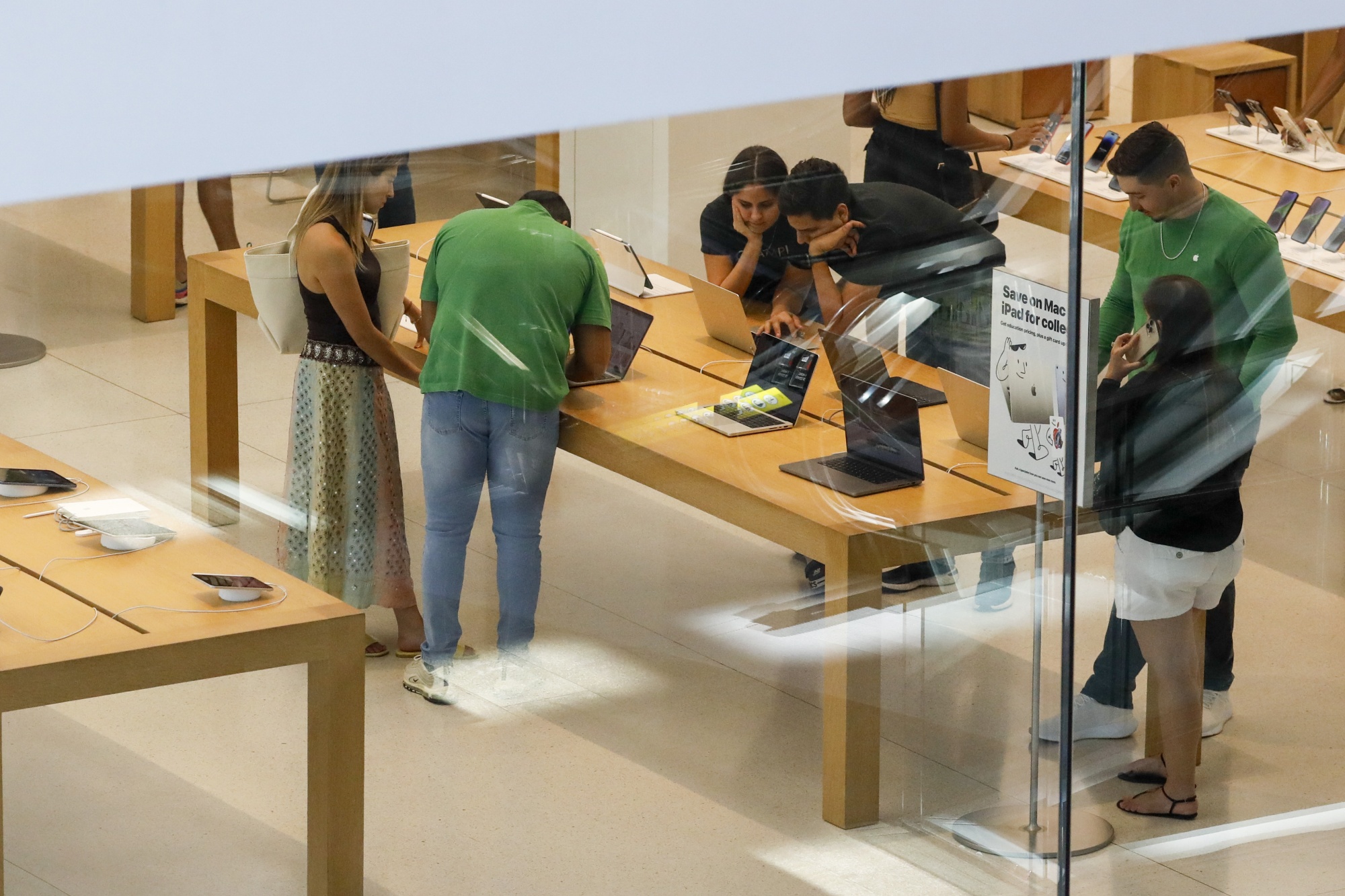 迈阿密Brickell City Centre苹果商店的顾客。摄影师:Eva Marie Uzcategui/Bloomberg**苹果商店将有一种新的销售产品方式。**首次,苹果零售店的销售人员将能够销售产品并直接通过他们的EasyPay销售点机器将产品运送给客户。