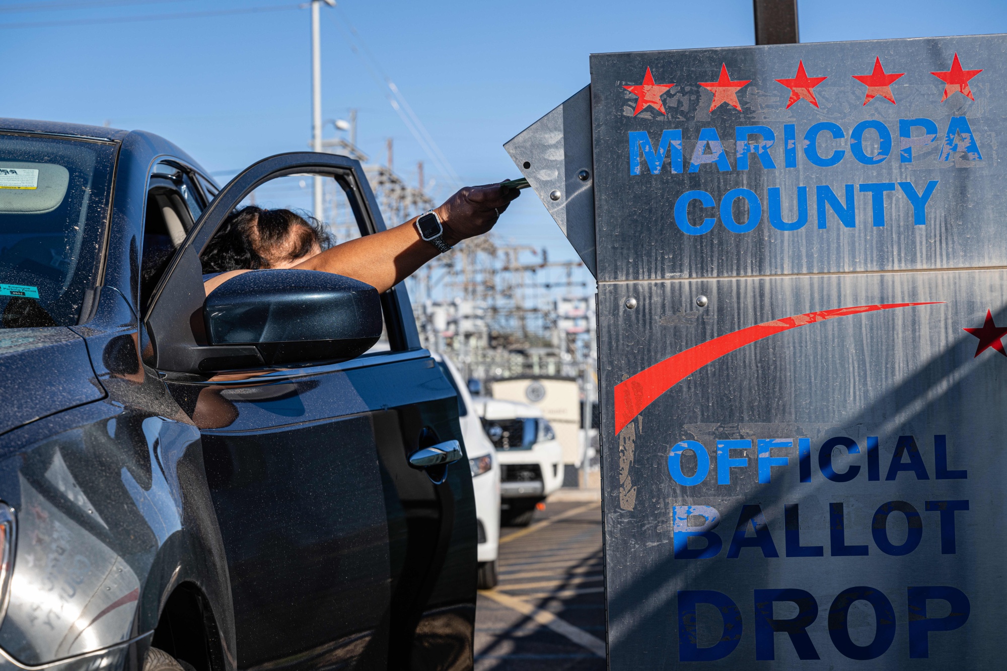 一个车内的选民在亚利桑那州凤凰城的马里科帕县计票和选举中心外的投票箱投票,日期为2022年11月8日。