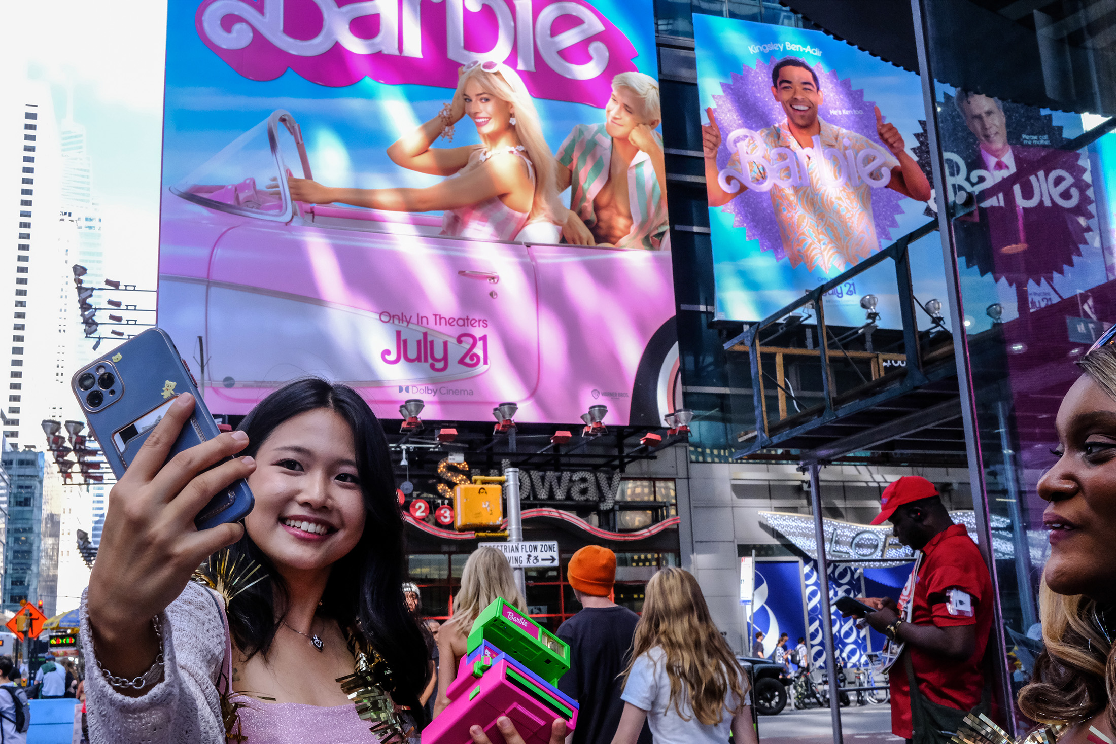 瑞恩·高斯林(左)和玛格特·罗比饰演肯和芭比。摄影师:华纳兄弟影业/华纳兄弟影业提供**大热门:**现在官方确认:目前世界上最大的电影明星是一个永远穿粉红色衣服的塑料芭比娃娃。芭比,由格蕾塔·葛韦格执导,玛格特·罗比主演,上周末在票房上获得了1.55亿美元的收入,成为了今年的最大开画。克里斯托弗·诺兰的奥本海默获得了8050万美元的票房,估计有20万名以上的电影观众在同一天购买了两部新片的票,这一现象现在被称为“芭本海默”。