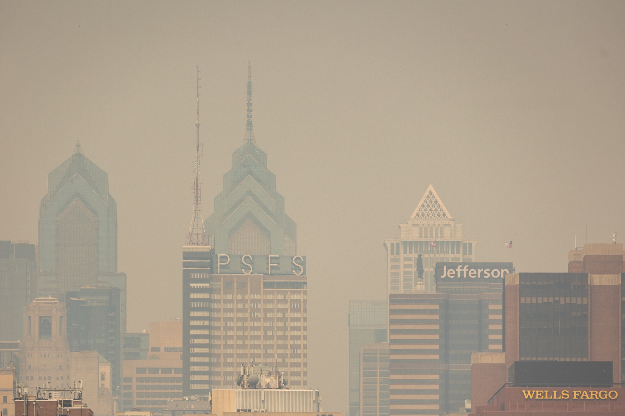 东海岸的城市,如费城(这里显示),在六月被加拿大野火的烟雾笼罩。