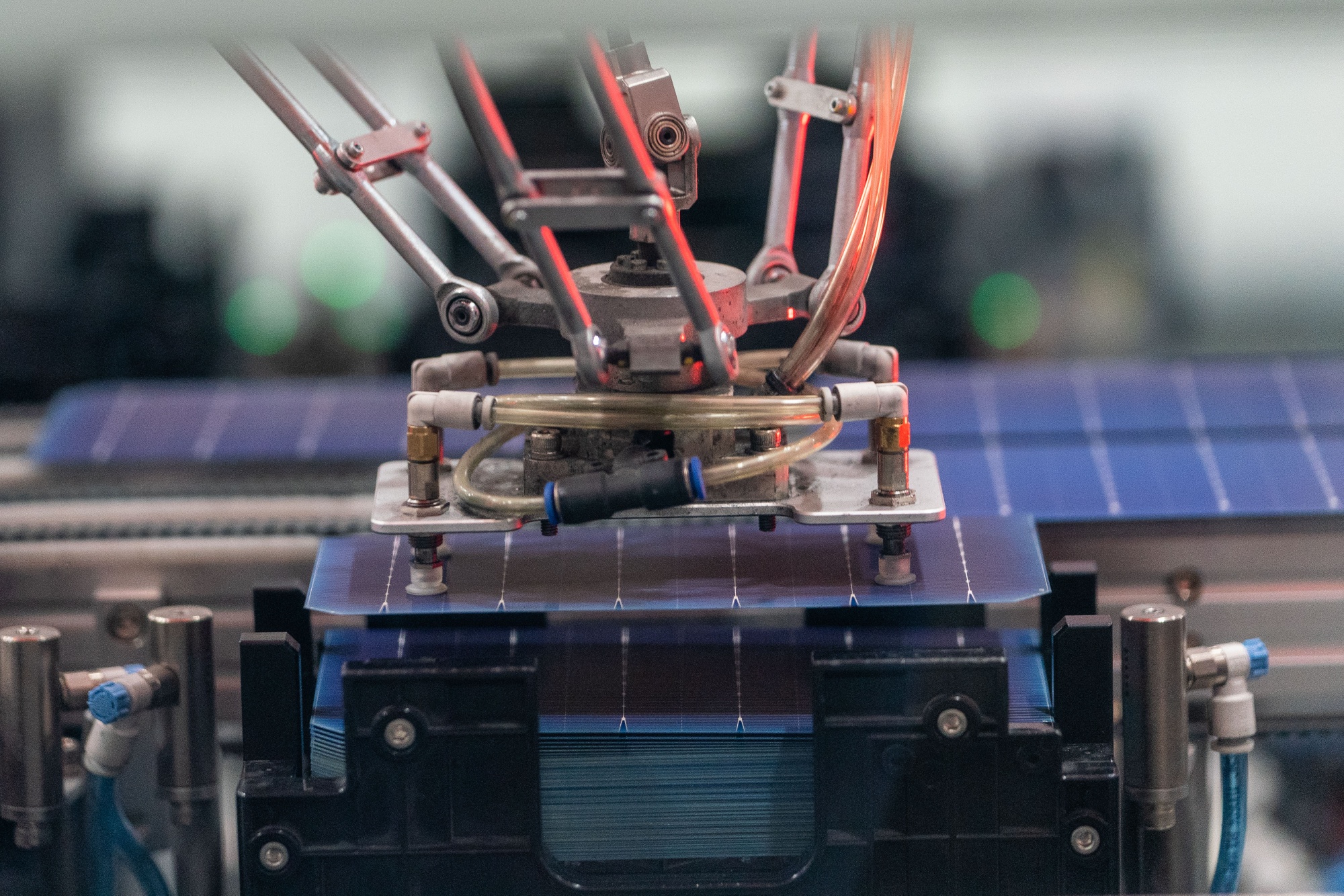 一台机器在乔治亚州道尔顿的太阳能电池和组件制造工厂中对太阳能电池进行分类和堆叠。