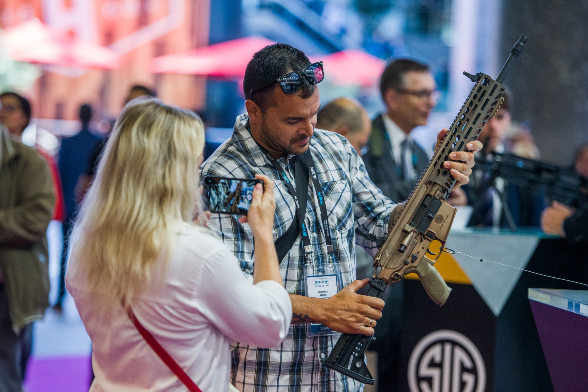 与会者在2022年6月13日巴黎举行的欧洲国防与安全贸易展上操作西格·索尔制造的自动步枪。摄影师:内森·莱恩/彭博### 你可以使用的解释