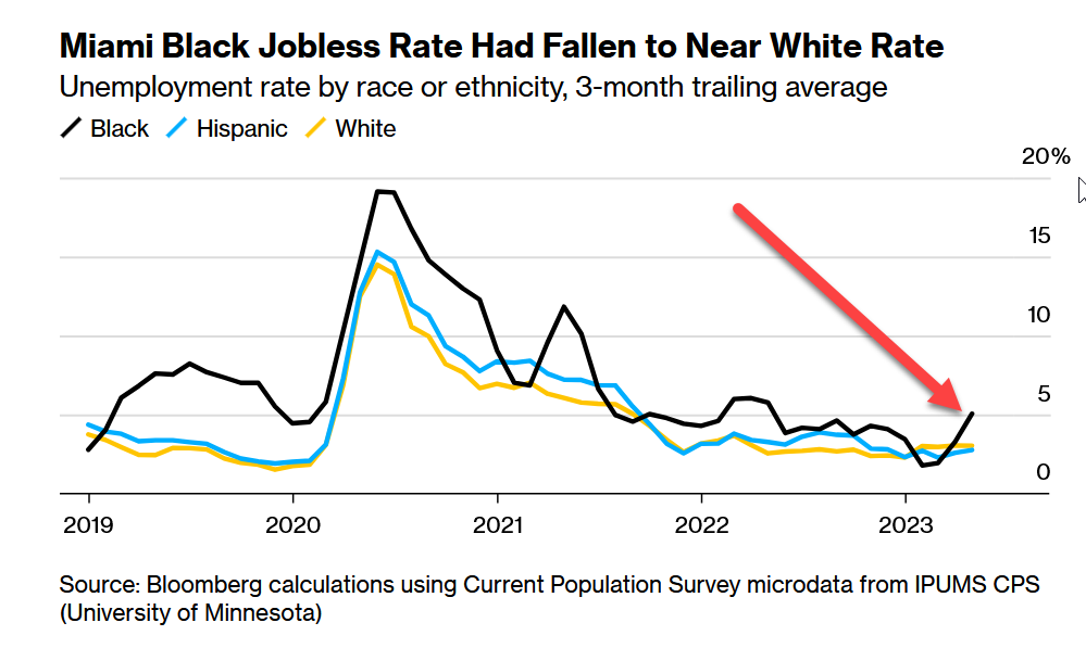 红色箭头指向了失业率急剧上升,这只能归因于利率上调。毕竟,美联储的工具是一种粗糙的工具。在委婉语言背后,降温经济意味着减缓投资,扼杀就业市场,从人们口袋里掏钱。实际上,美联储的药物会让一些患者丧命 — 至少对于黑人美国人来说是这样。事实上,全国范围内,黑人工人占最近失业率上升的近90%。冷却的劳动力市场意味着拉丁裔工人和没有高中学历的人失业率上升。这也意味着那些试图重新踏入劳动力市场的临时工作减少。因此,随着通货膨胀下降,有些人会看到自己的工资能够更远。而另一些人会看到自己的工资完全消失。
