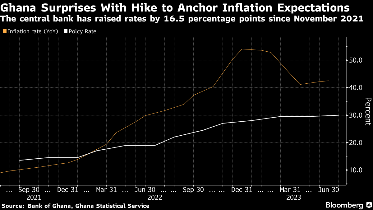 加纳央行出人意料地将借贷成本提高到创纪录的30%,以加快通胀的减速。自2021年9月以来,年通胀率一直高于央行的6%至10%目标范围,在过去两个月意外地加快,达到42.5%。