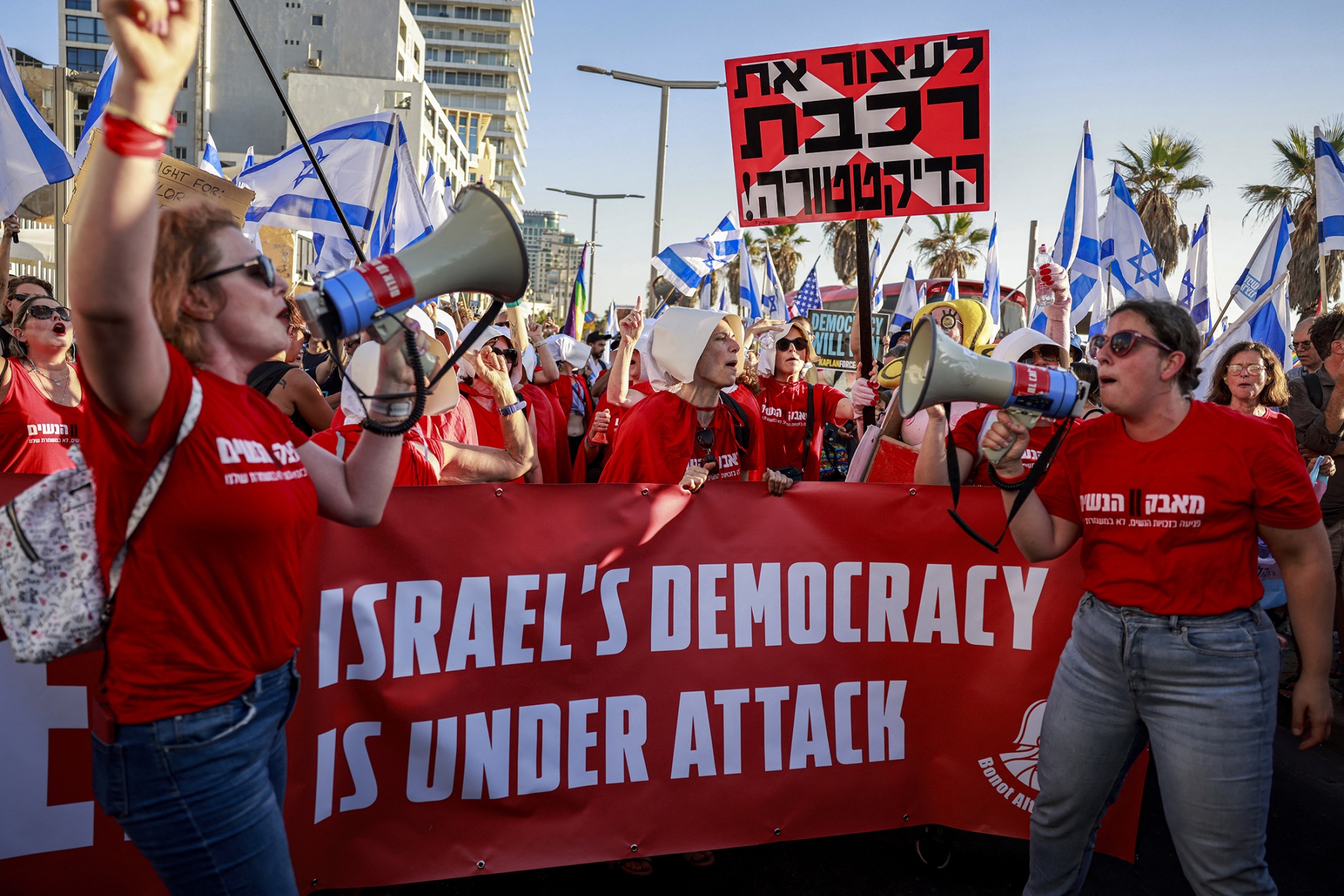 摄影师:Kobi Wolf/Bloomberg在上周末数十万反政府抗议者挥舞着蓝白色以色列国旗的人群中,最引人注目的是穿着鲜艳红色T恤和玛格丽特·阿特伍德(Margaret Atwood)反乌托邦小说《使女的故事》中角色的红披风和白色无边帽的女性。