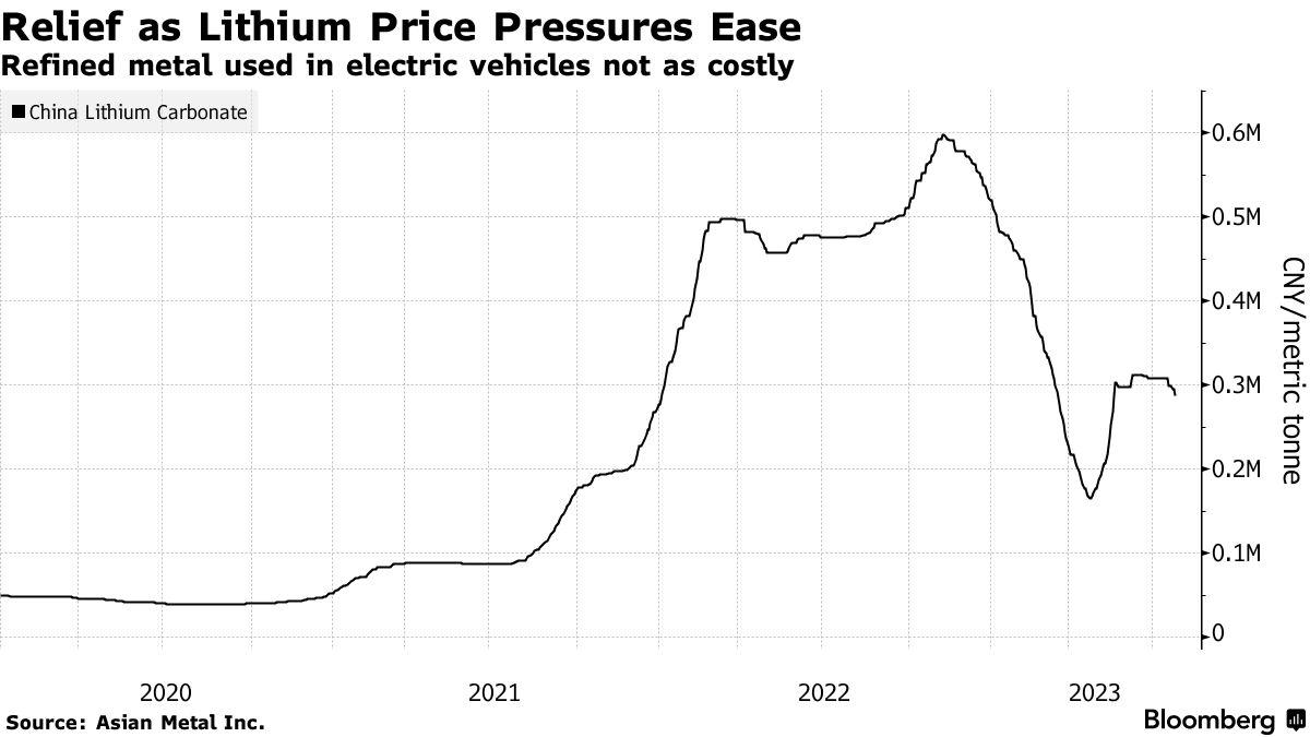 电动汽车电池中使用的金属的精炼形式——碳酸锂的中国价格已从去年的一半下降,缓解了CATL的成本压力。