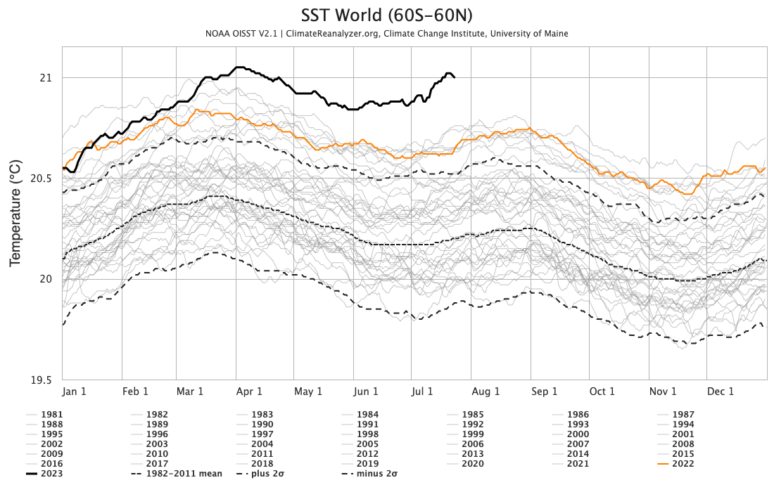 今年夏天,全球范围内陆地上打破温度记录的热浪并不局限于陆地。目前海洋的温度比有史以来收集数据以来的任何时候都要高,全球约44%的海洋目前正在经历极端温度,根据美国国家海洋和大气管理局(NOAA)收集的数据。