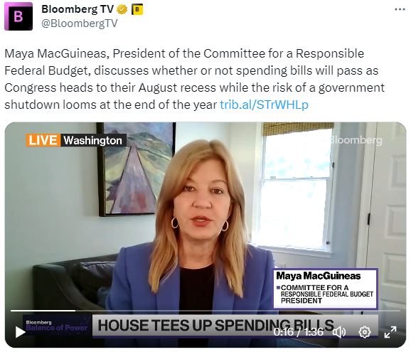 今天在彭博电视台的权力平衡**节目中,主持人安玛丽·霍登和乔·马修采访了民主党参议员迈克尔·贝内特和共和党参议员玛莎·布莱克本,国会正赶在八月休会之前进行竞赛。在昨天的节目中,负责负责任联邦预算委员会的玛雅·麦克吉尼斯讨论了立法者是否能在支出法案上取得进展。