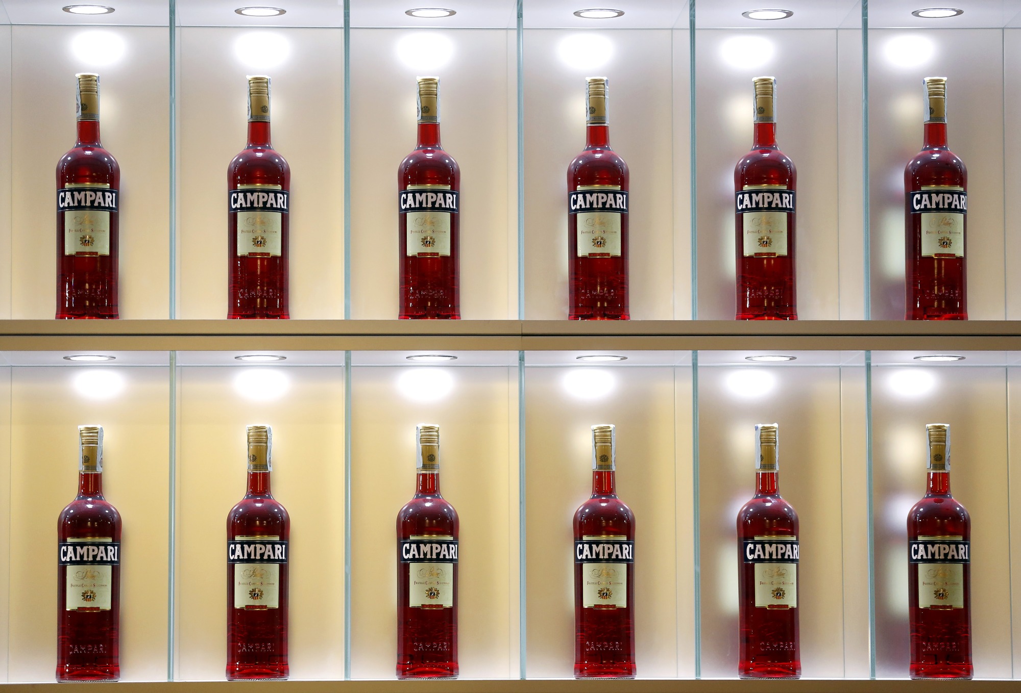 在米兰的Davide Campari-Milano SpA总部的Campari酒瓶。摄影师:Alessia Pierdomenico/Bloomberg