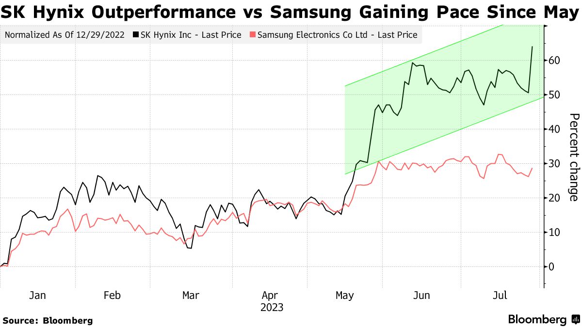 SK海力士公司周四上涨了三年来最多,扩大了其在2023年对三星电子公司的巨大领先优势,因为人工智能成为韩国存储芯片股票投资者的主题。