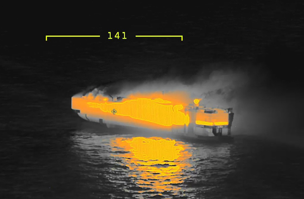 弗里曼特尔海威号船上的火灾热成像。来源:荷兰海岸警卫队Ford Motor Co.,Stellantis NV,雷诺公司和日产汽车公司表示,他们的船上没有任何车辆。丰田汽车公司表示,该公司可能没有货物在船上。