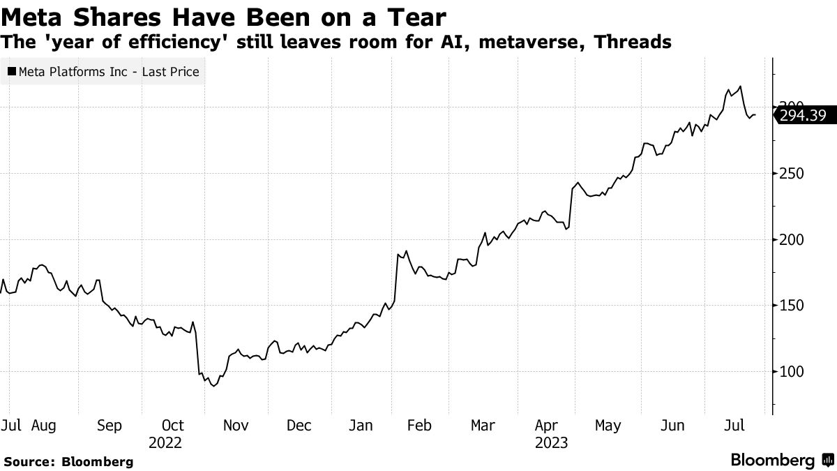 周三,Meta预计销售额将在第三季度恢复两位数的百分比增长,市场似乎愿意暂时相信扎克伯格的愿景。Meta股价在其财报和预测发布后上涨了多达9%,达到了自2022年1月以来的最高水平。