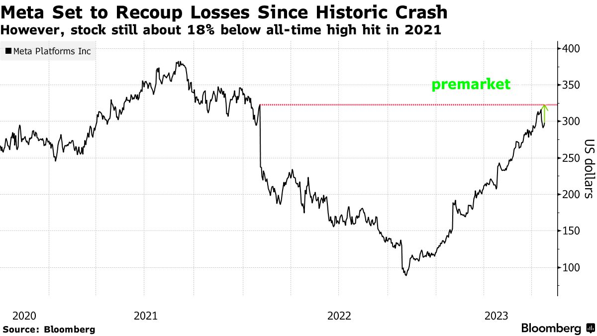 今年已经翻了一番多,Meta的股价在纽约开盘时最多上涨了9%,达到325.35美元。华尔街在2022年2月因未达到收入预期和报告用户基数停止增长而惩罚了该公司,但现在却对显示成本得到控制、广告收入和订户增长好于预期的结果表示赞赏。