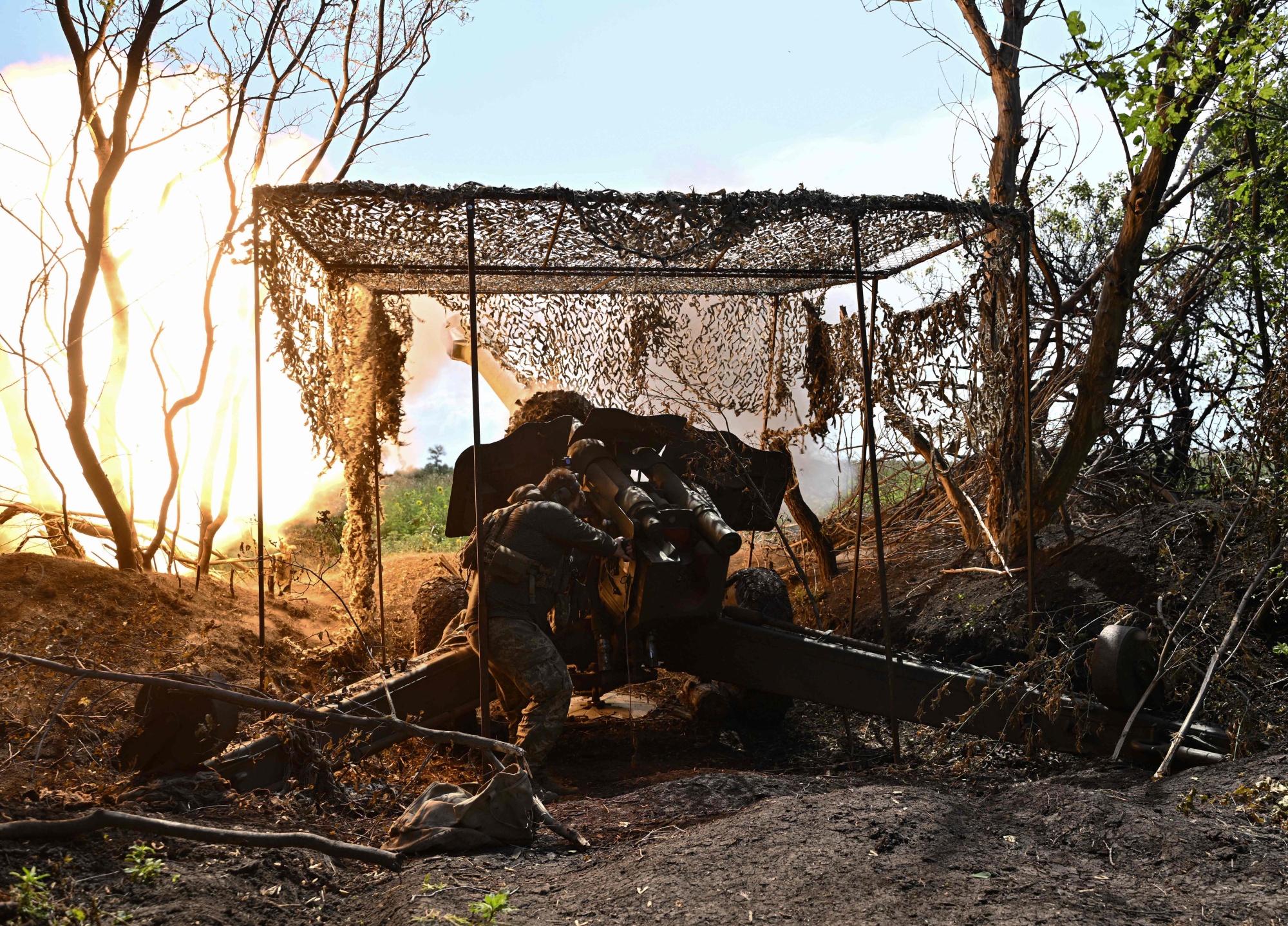 一名乌克兰炮兵在乌克兰巴赫穆特附近向俄罗斯阵地开火。