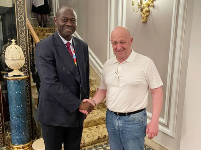 瓦格纳雇佣兵的创始人叶甫根尼·普里戈津在圣彼得堡与一位中非共和国高级官员会面,这张照片是周四发布在与他的团体相关的一个Telegram频道上的。