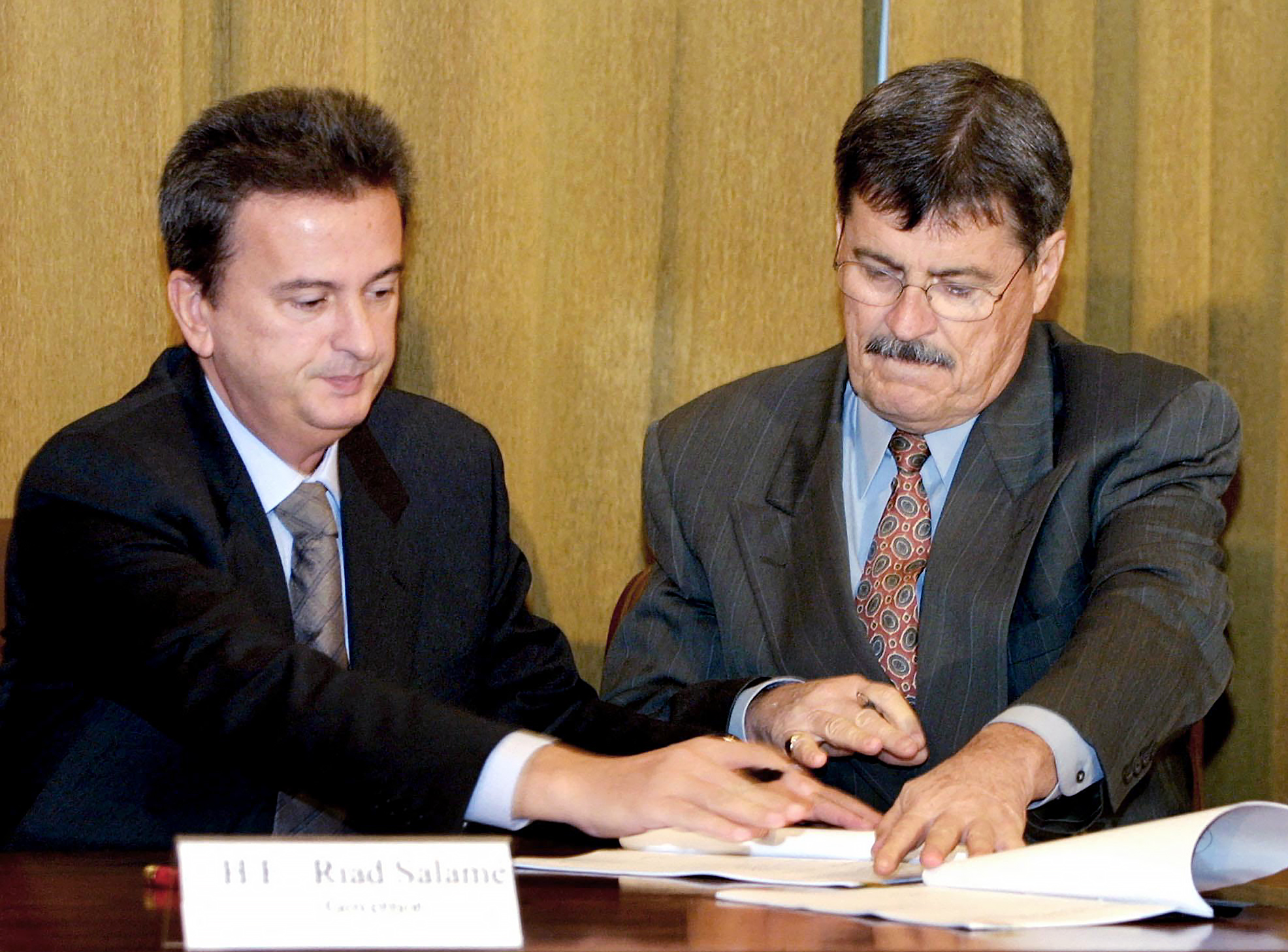 2001年,左起:里亚德·萨拉默和前驻黎巴嫩美国大使文森特·巴特尔。摄影师:Joseph Barrak/AFP/Getty Images萨拉默一再为这些政策辩护,称他为政治家争取了时间来实施改革。但2019年的金融危机使黎巴嫩陷入困境,摧毁了他的遗产;几十年来的货币挂钩解体,金融部门出现了约700亿美元的漏洞,该国首次违约。