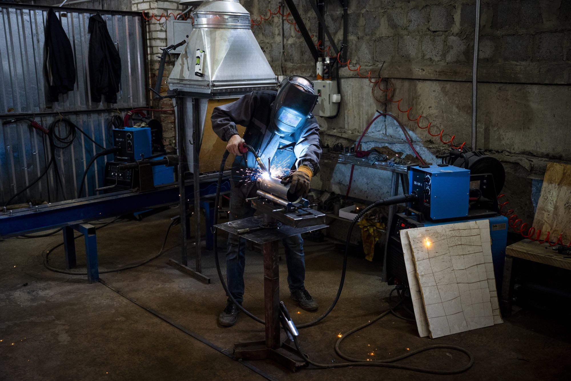 一名工人在乌克兰利沃夫地区的A.M.P Hydro生产活塞的焊接车间里焊接气缸,时间是6月29日。摄影师:Pete Kiehart/Bloomberg