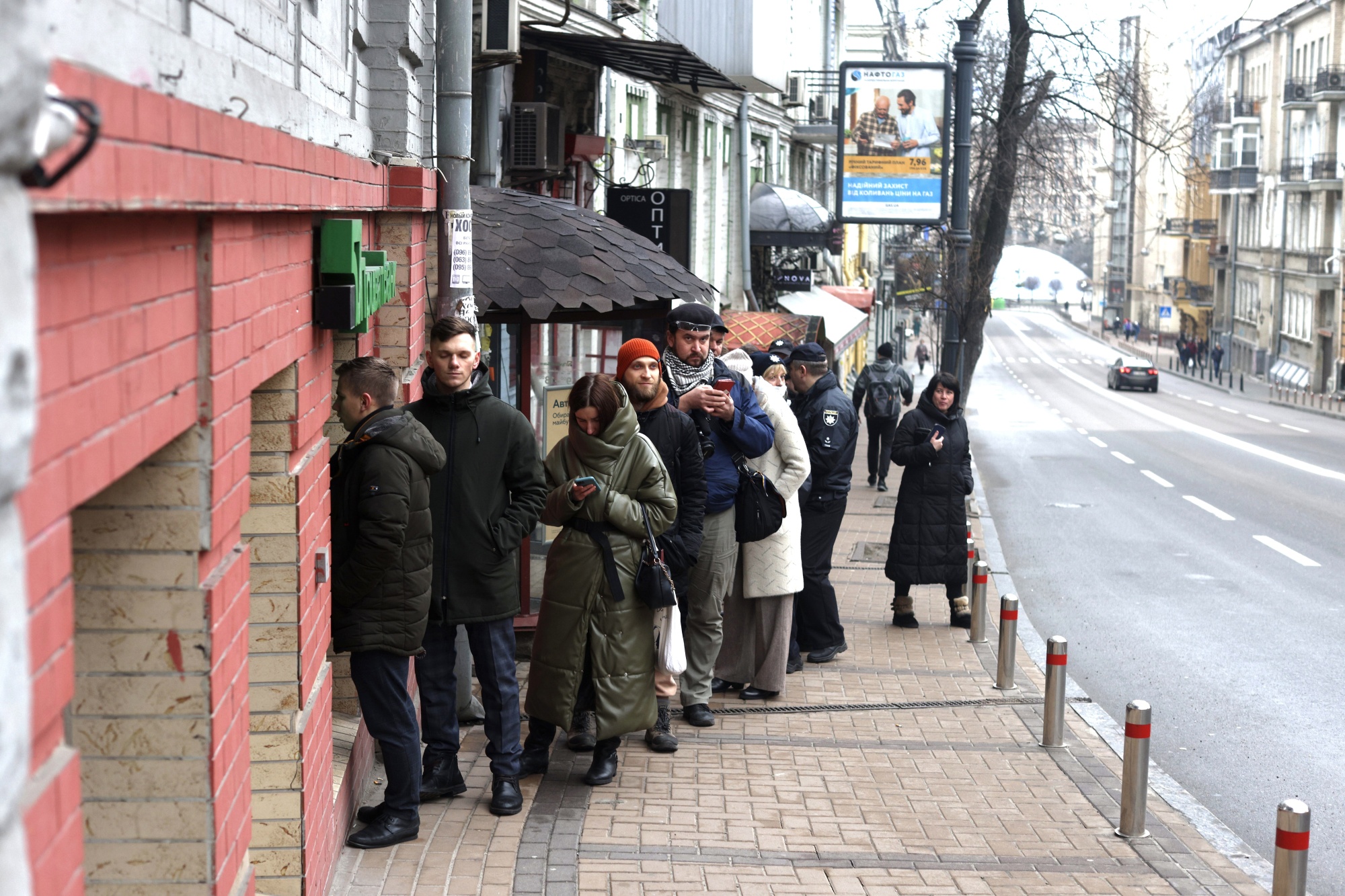 顾客在基辅的PrivatBank CJSC分行排队使用自动取款机,2022年2月24日。摄影师:Ethan Swope/Bloomberg现在它们已成为遭受打击的经济的重要资金来源,推动补贴贷款并帮助资助资金短缺的国家,即使私人银行为减少风险敞口而收缩。