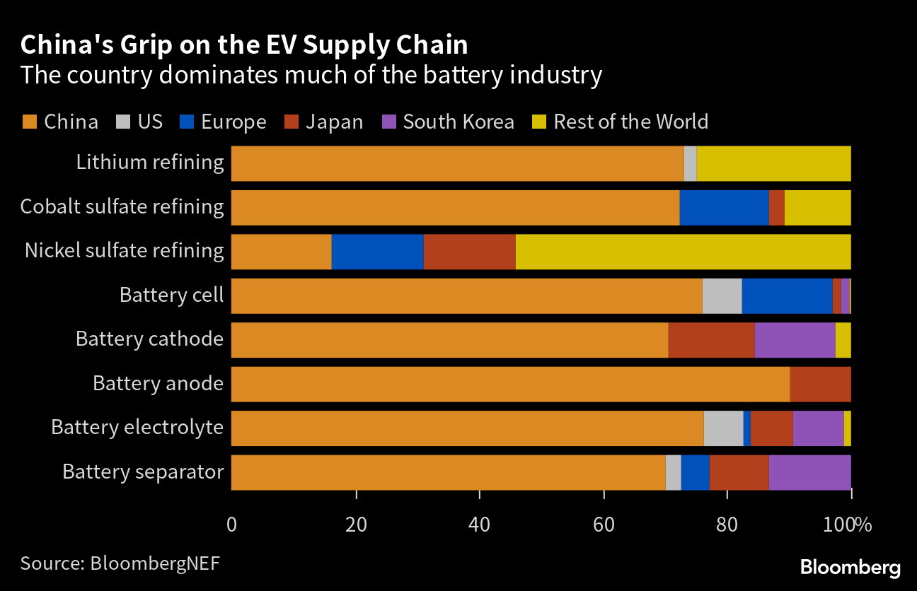 中国公司主导全球电池和电池材料供应链,为韩国三大电动汽车电池制造商 — LG Energy Solution Ltd.、三星SDI有限公司和SK On有限公司生产正极、负极和前体。然后这三家公司向通用汽车公司、特斯拉公司和大众汽车公司等电动汽车制造商供应产品。